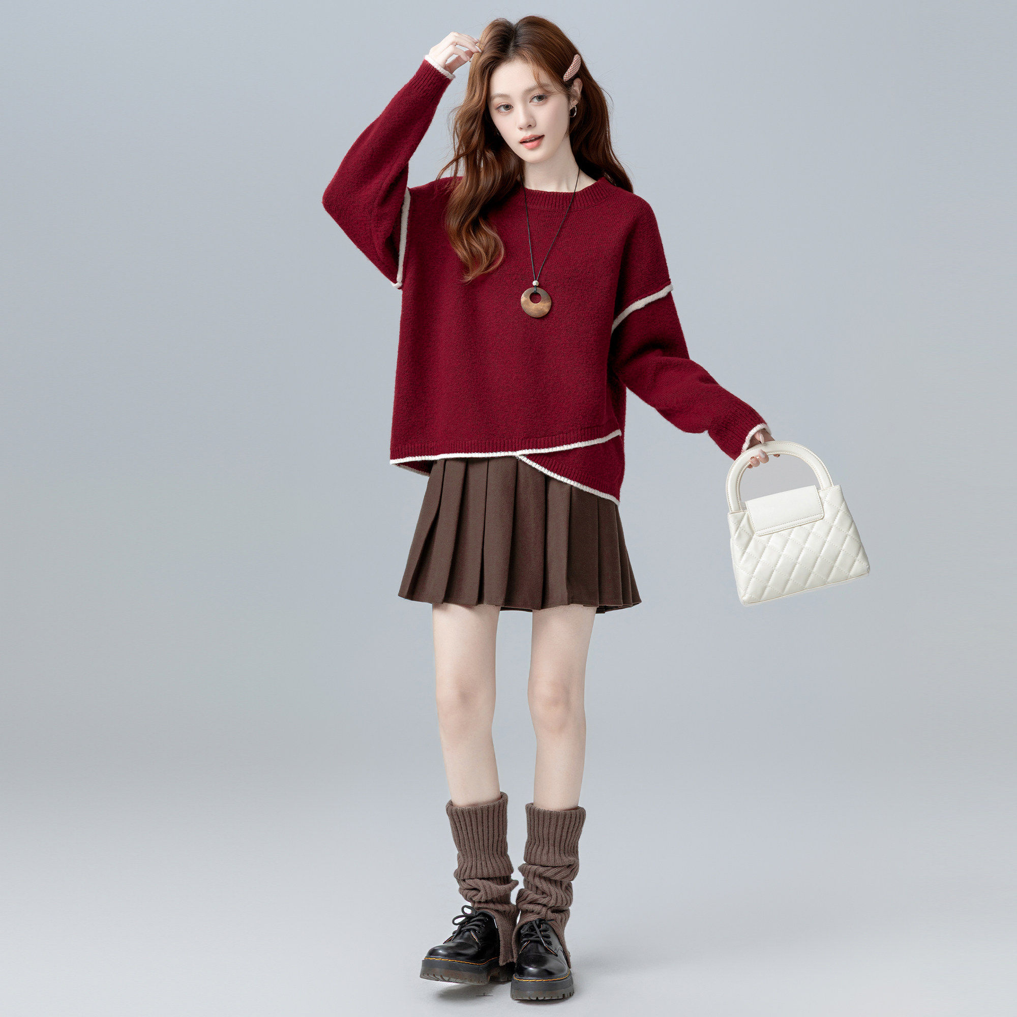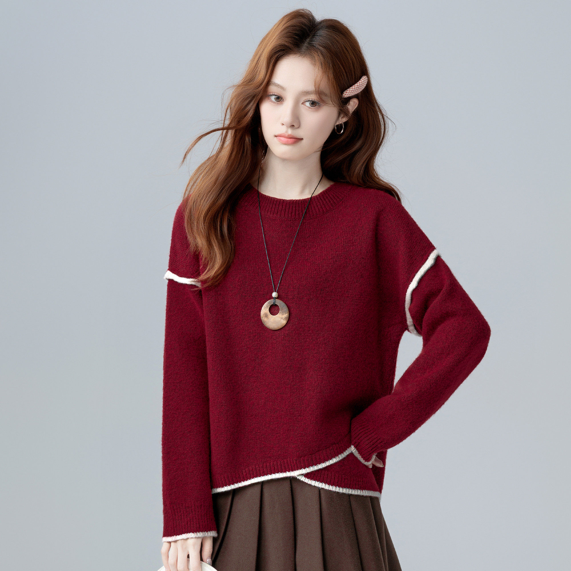 小众不规则红色圆领长袖套头毛衣女2025秋冬新款短款针织内搭上衣