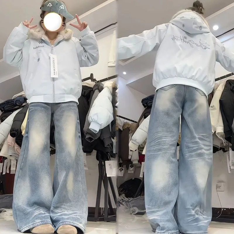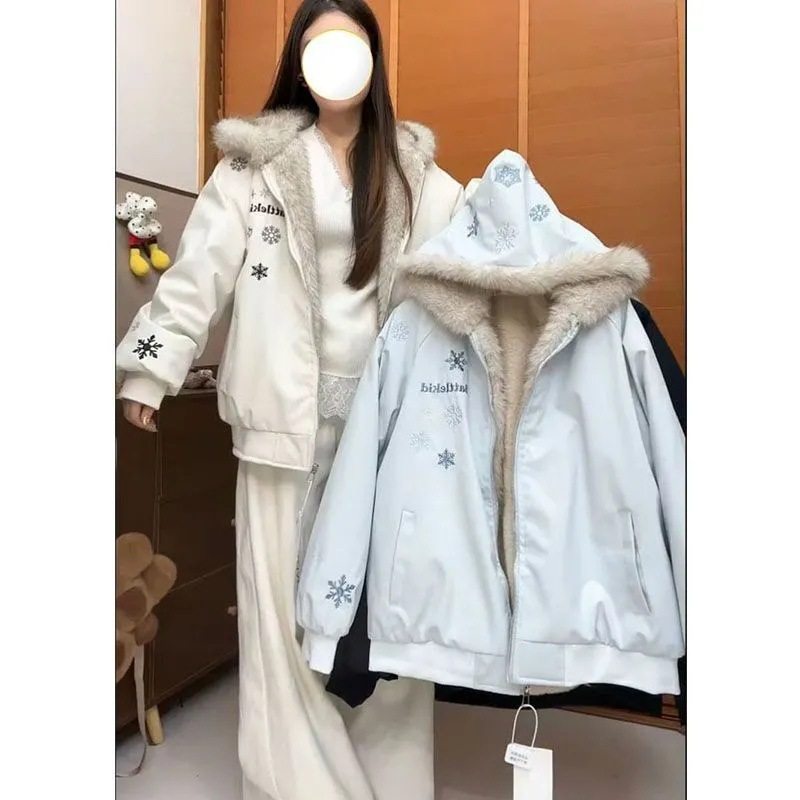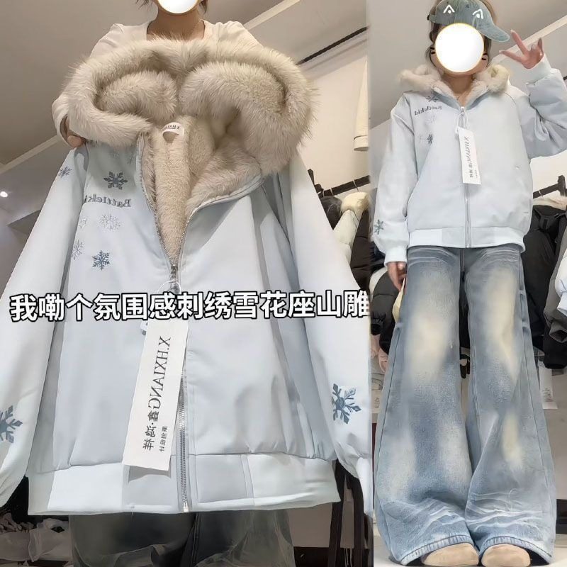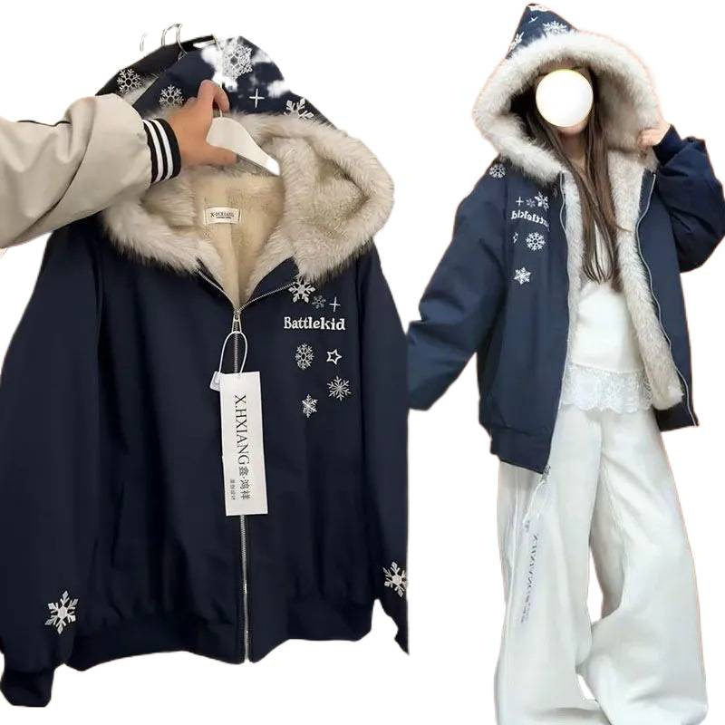 美式高街雪花刺绣加绒加厚毛领连帽座山雕棉服女冬季保暖宽松外套