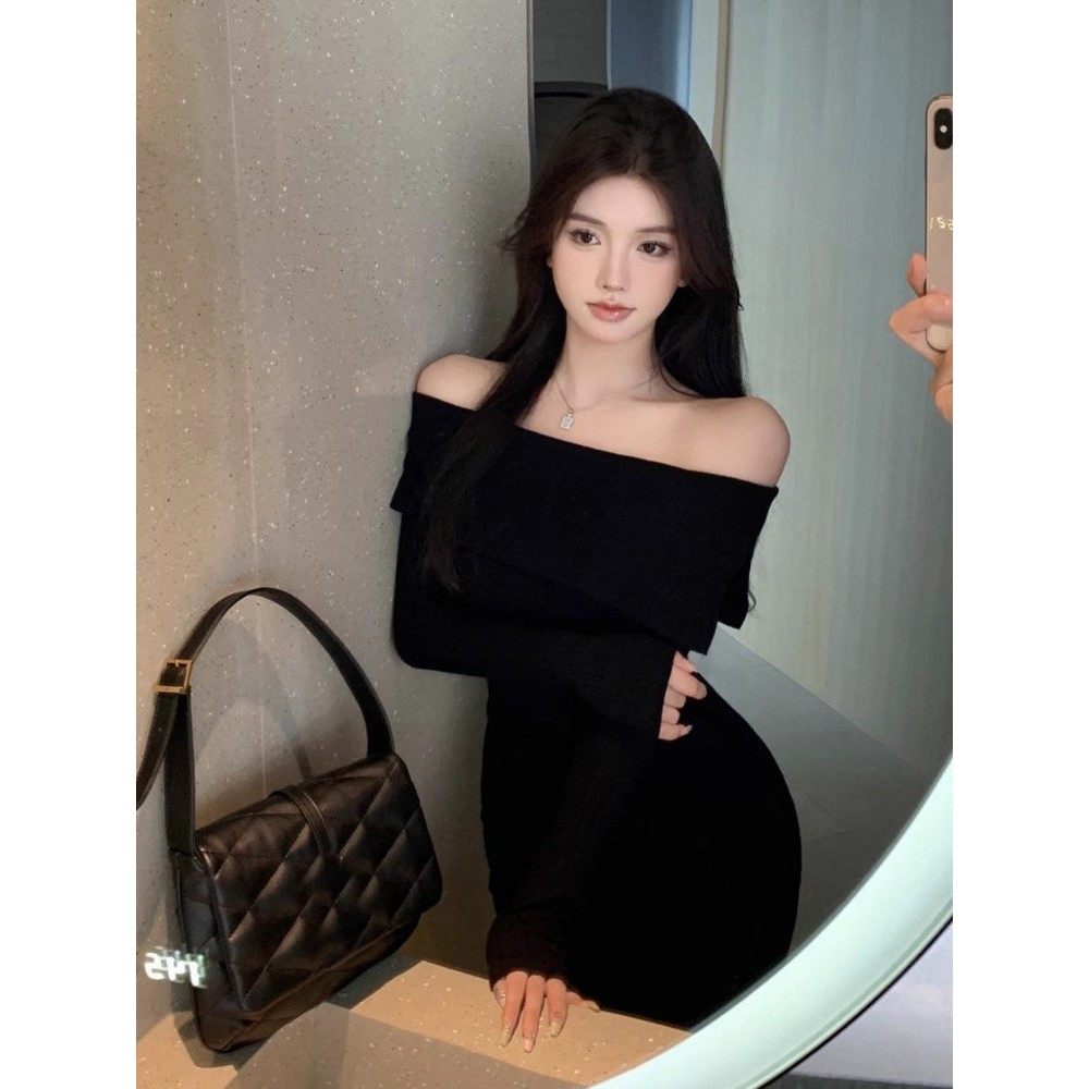 性感白色针织一字肩抹胸连衣裙女春秋内搭修身包臀百搭毛衣长裙子