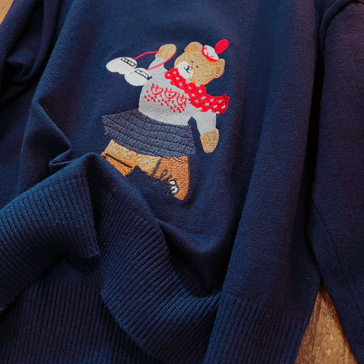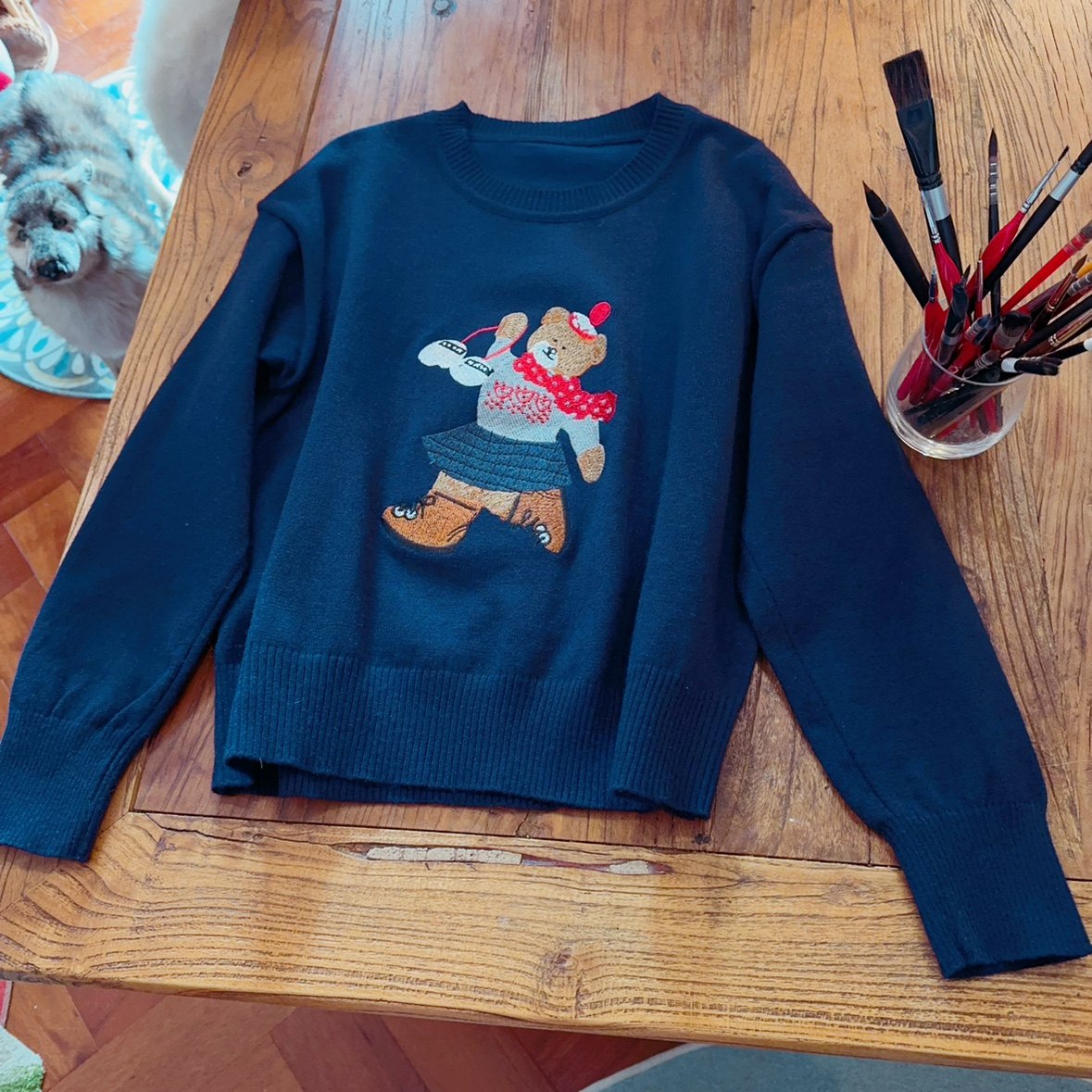 刺绣小熊 可爱日系森女 田园风 复古绀色学院风 套头针织衫毛衣