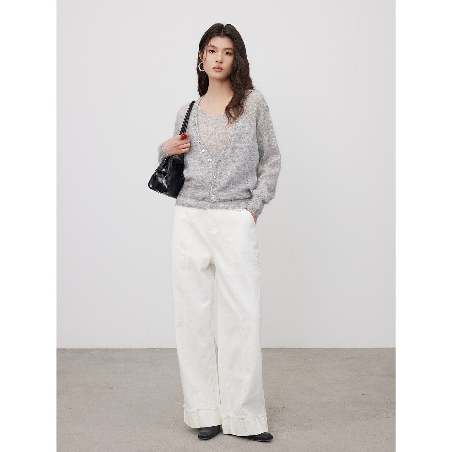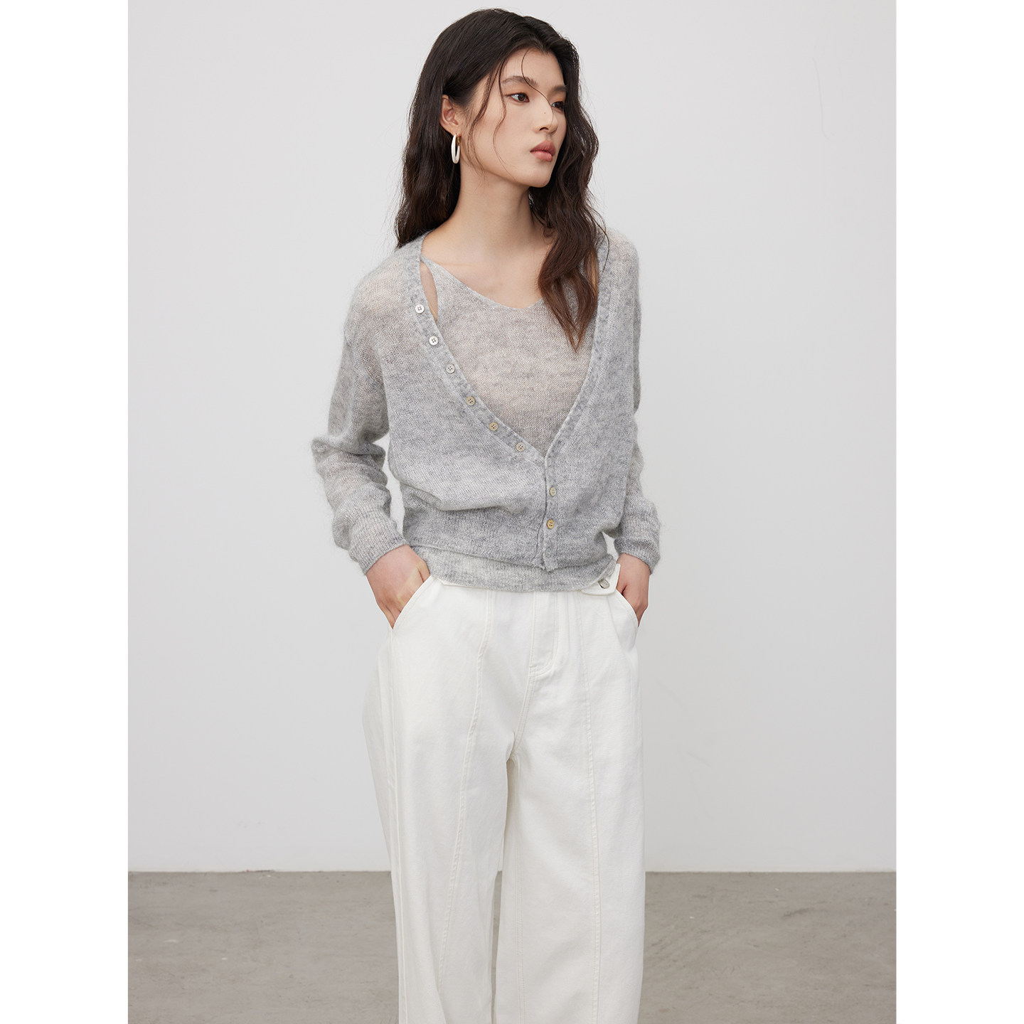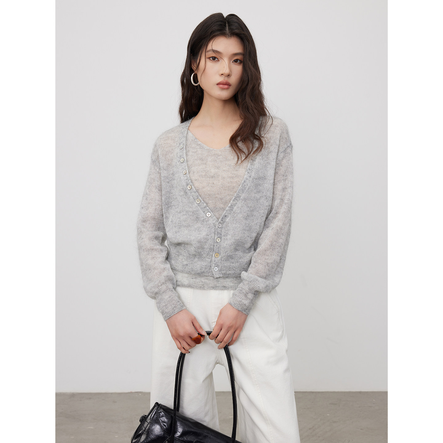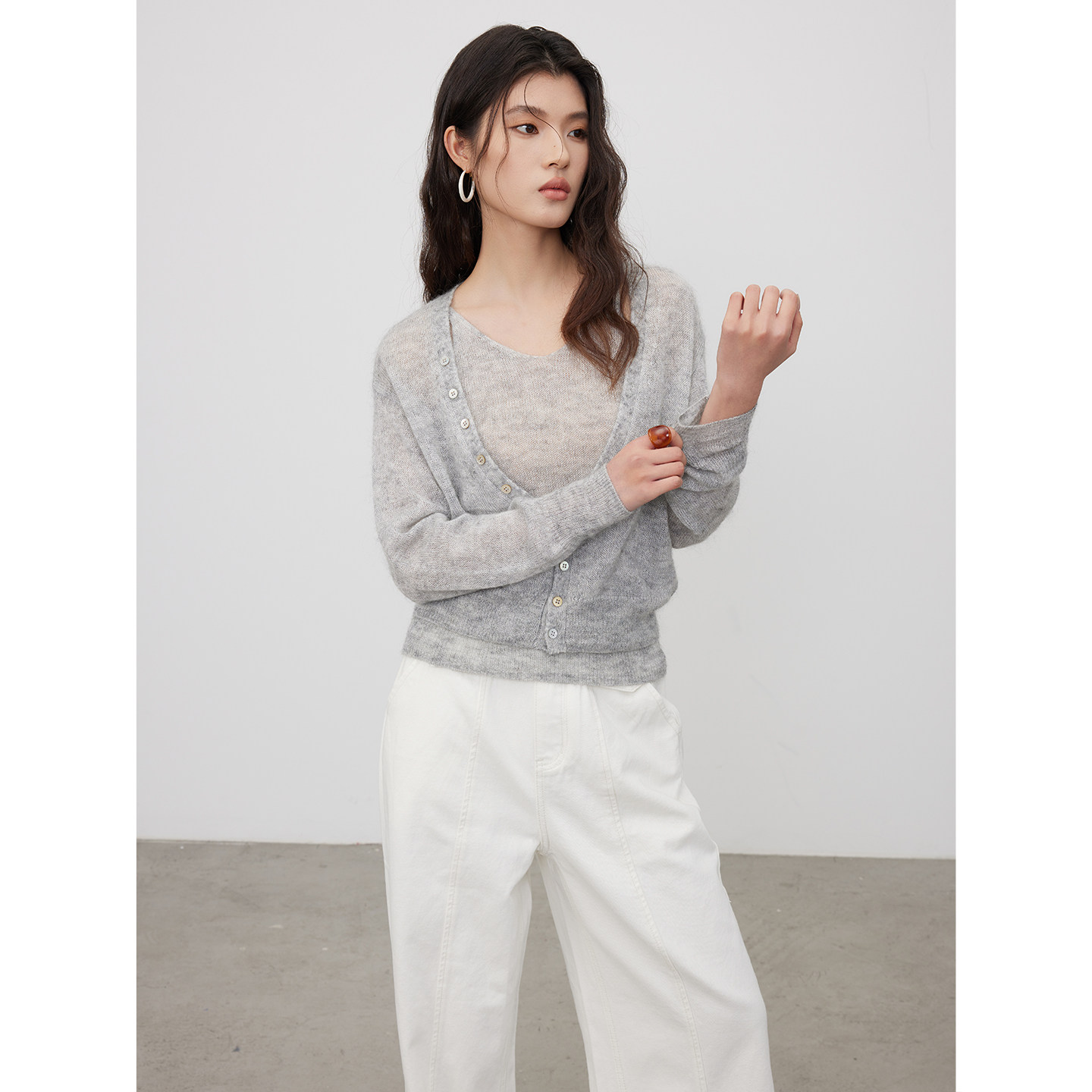 KEAR 灰色v领纽扣长袖针织衫女春季设计感慵懒背心开衫两件套上衣