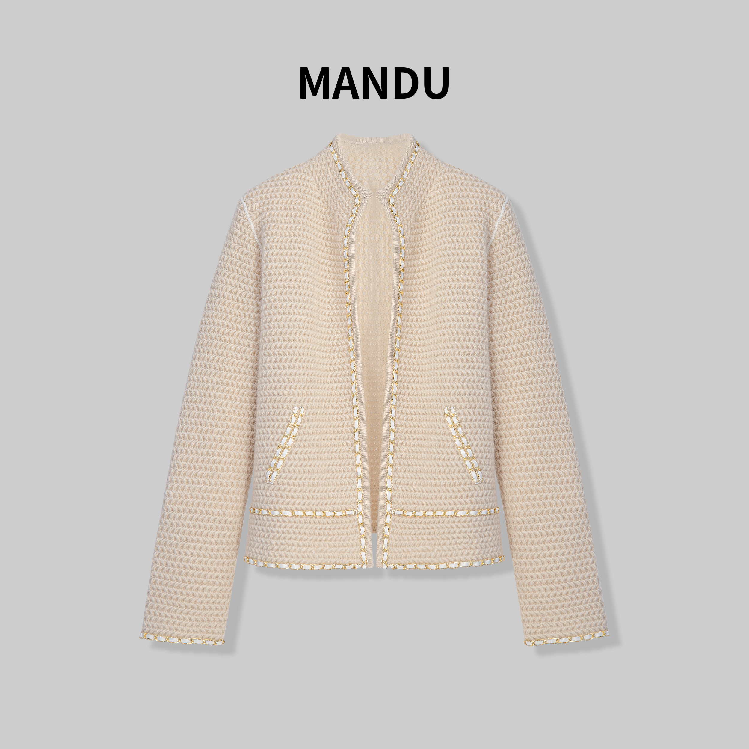 嫚渡|100%山羊绒轻奢小香风时尚厚款圆领长袖杏色编织羊绒外套