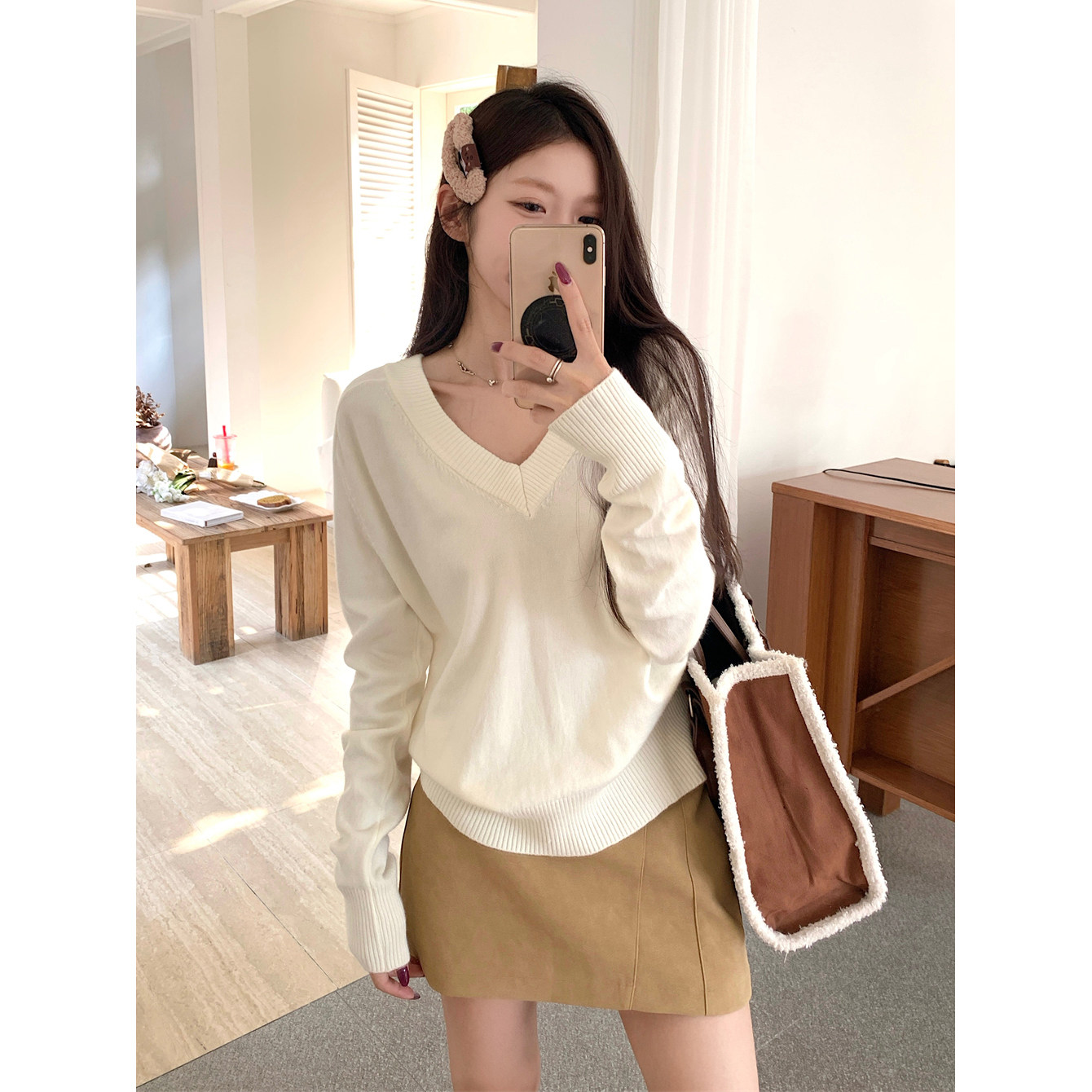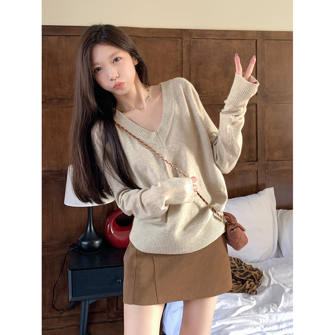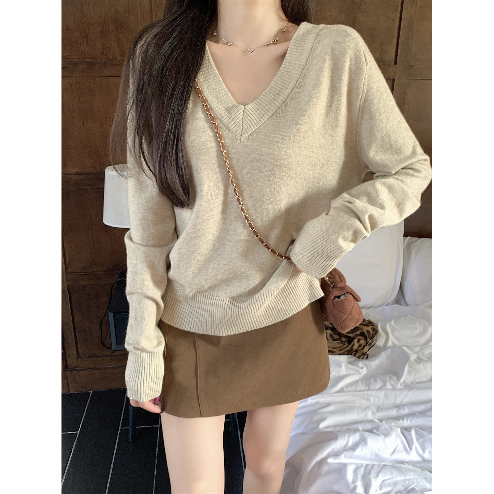 首页> 女装> 极简风v领宽松慵懒针织上衣女春秋冬休闲时髦内搭打底衫简约毛衣