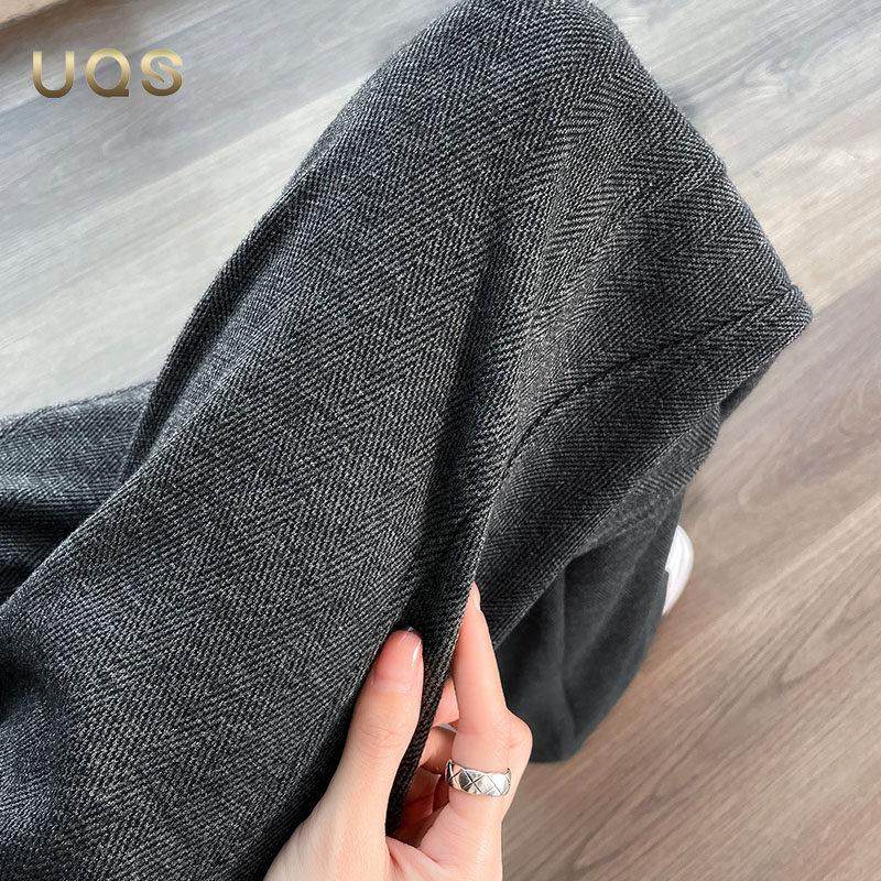 UQS杏色毛呢休闲阔腿裤女秋季新款2025设计感开叉宽松显瘦直筒裤