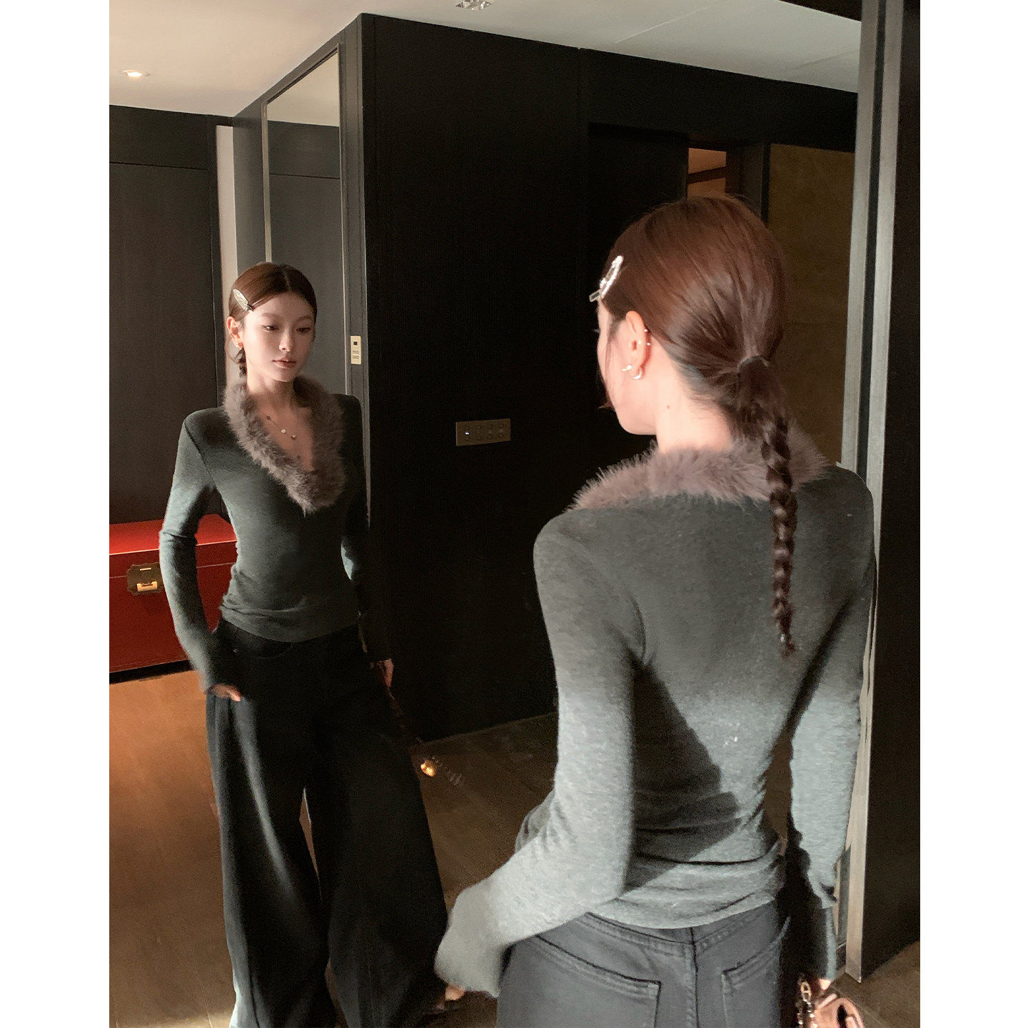 HAMYIHO 内搭女毛领上衣冬季针织衫修身毛衣毛毛打底衫设计感小众