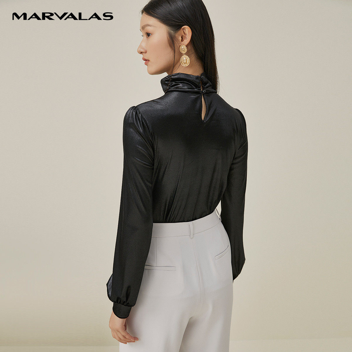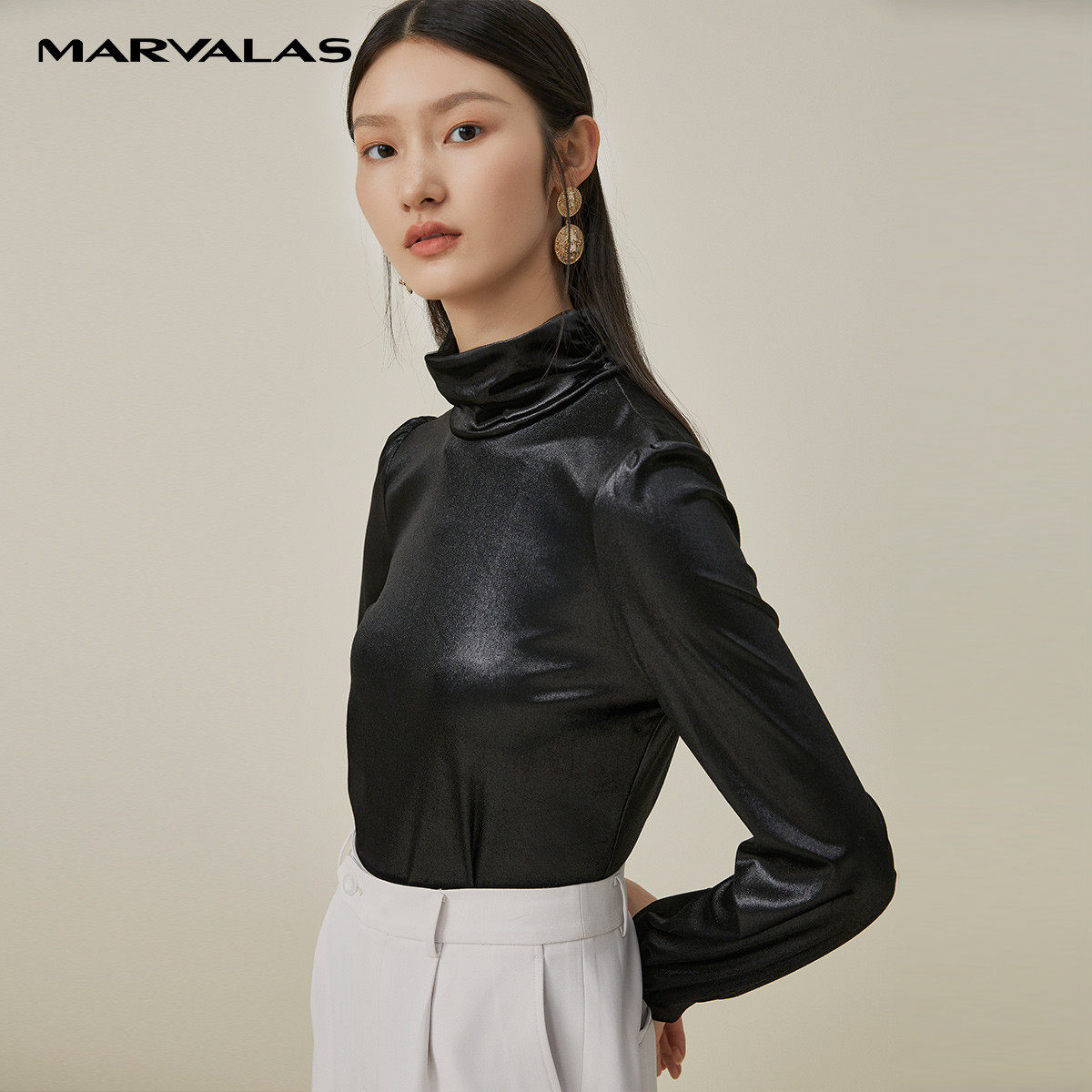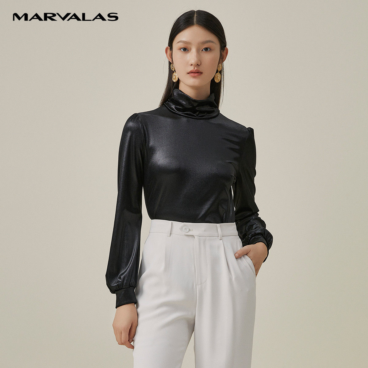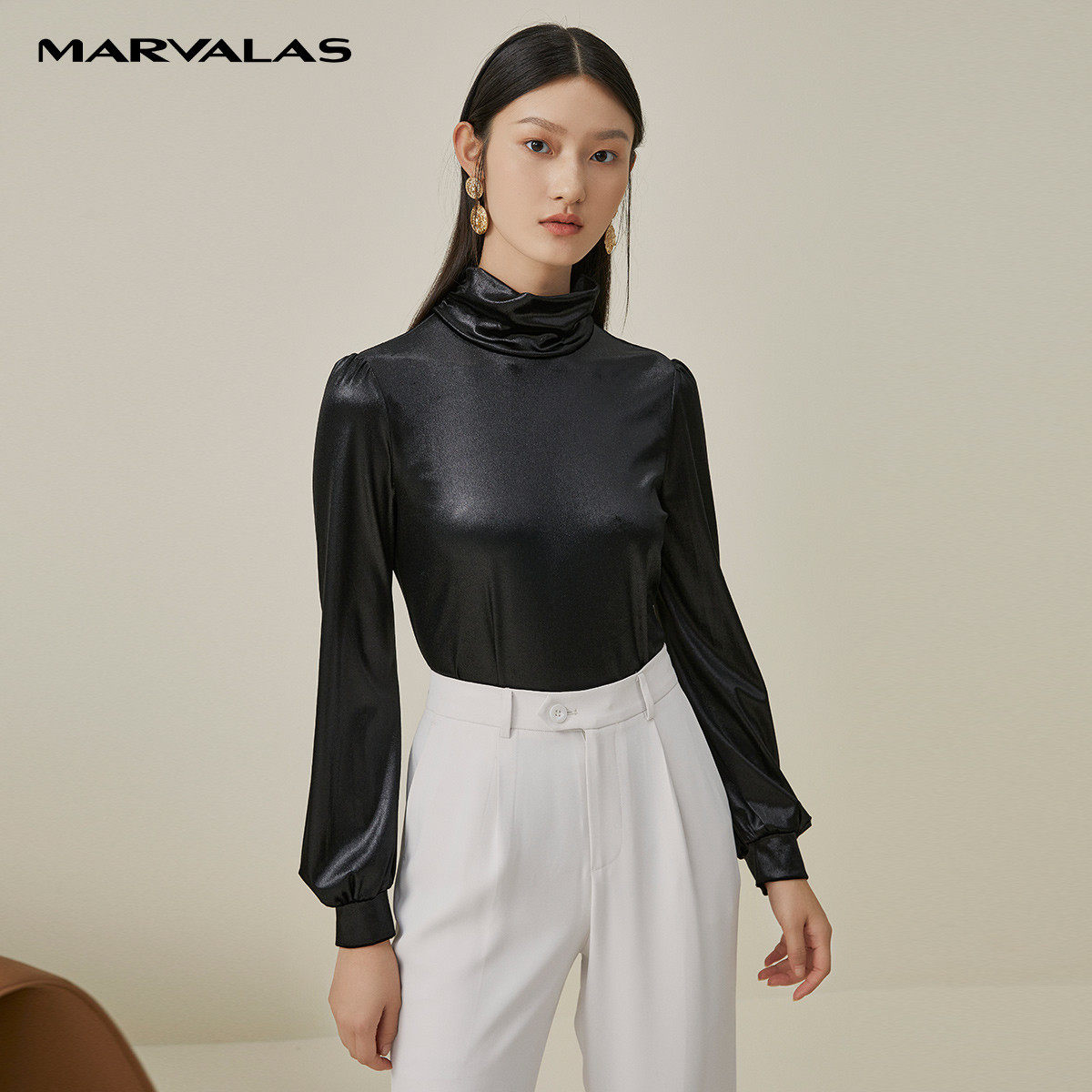 【粉丝专属】纯色百搭亮面丝绒T恤女秋季堆堆领灯笼袖打底衫33107