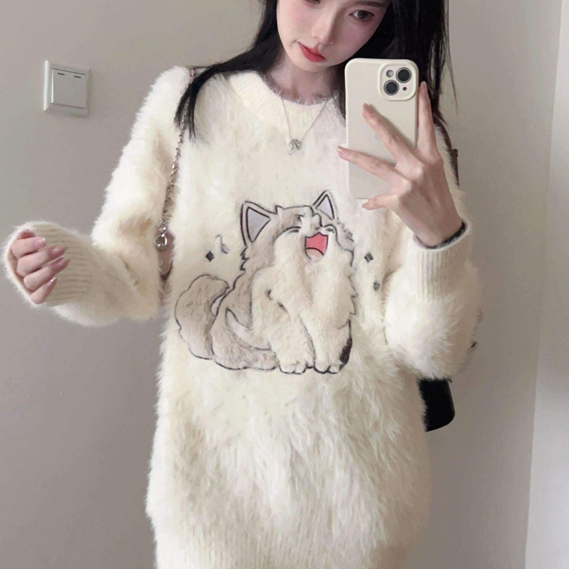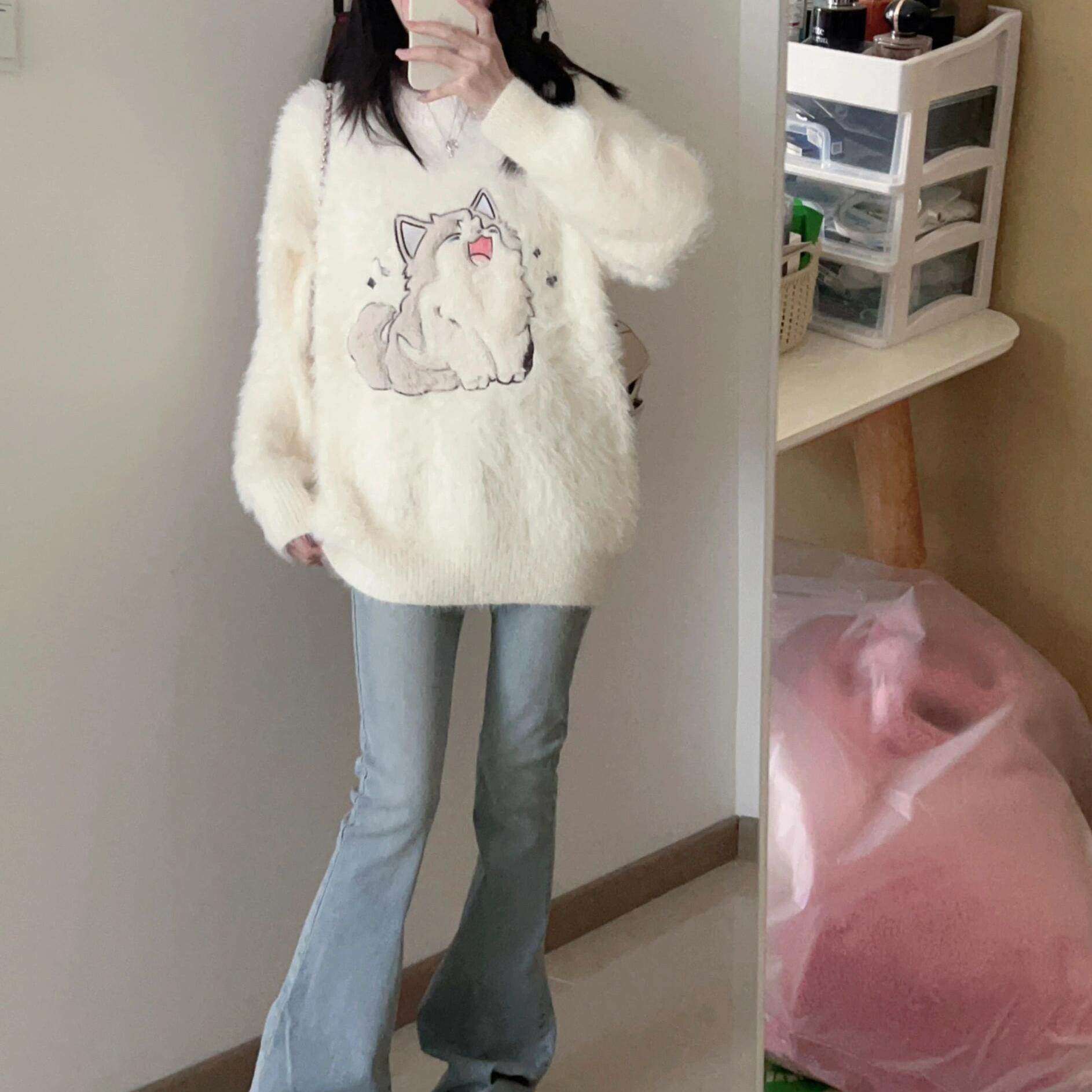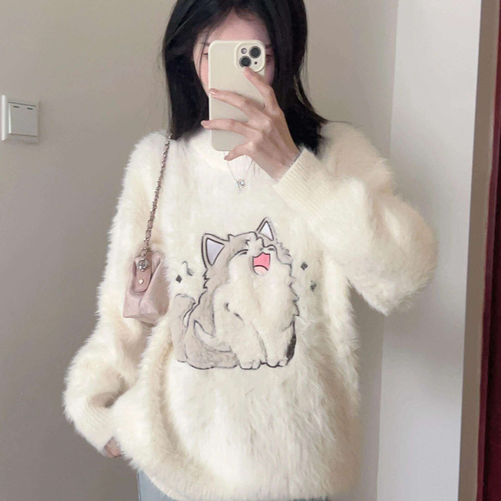 加厚版!慵懒风卡通水貂绒套头毛衣女冬季新款韩版宽松学生针织衫