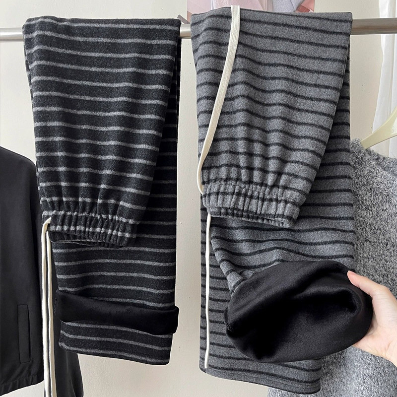 小个子150加绒条纹糯米裤女冬季加厚针织裤宽松抽绳休闲阔腿长裤