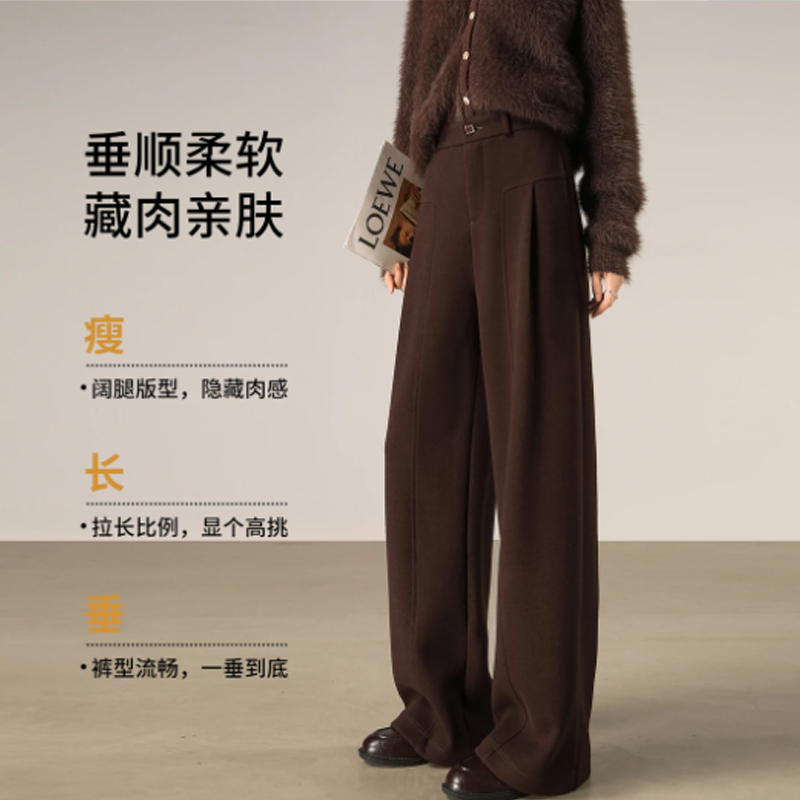 啄木鸟毛呢阔腿裤女2025新款秋冬季加厚棕咖色美拉德弯刀西装裤