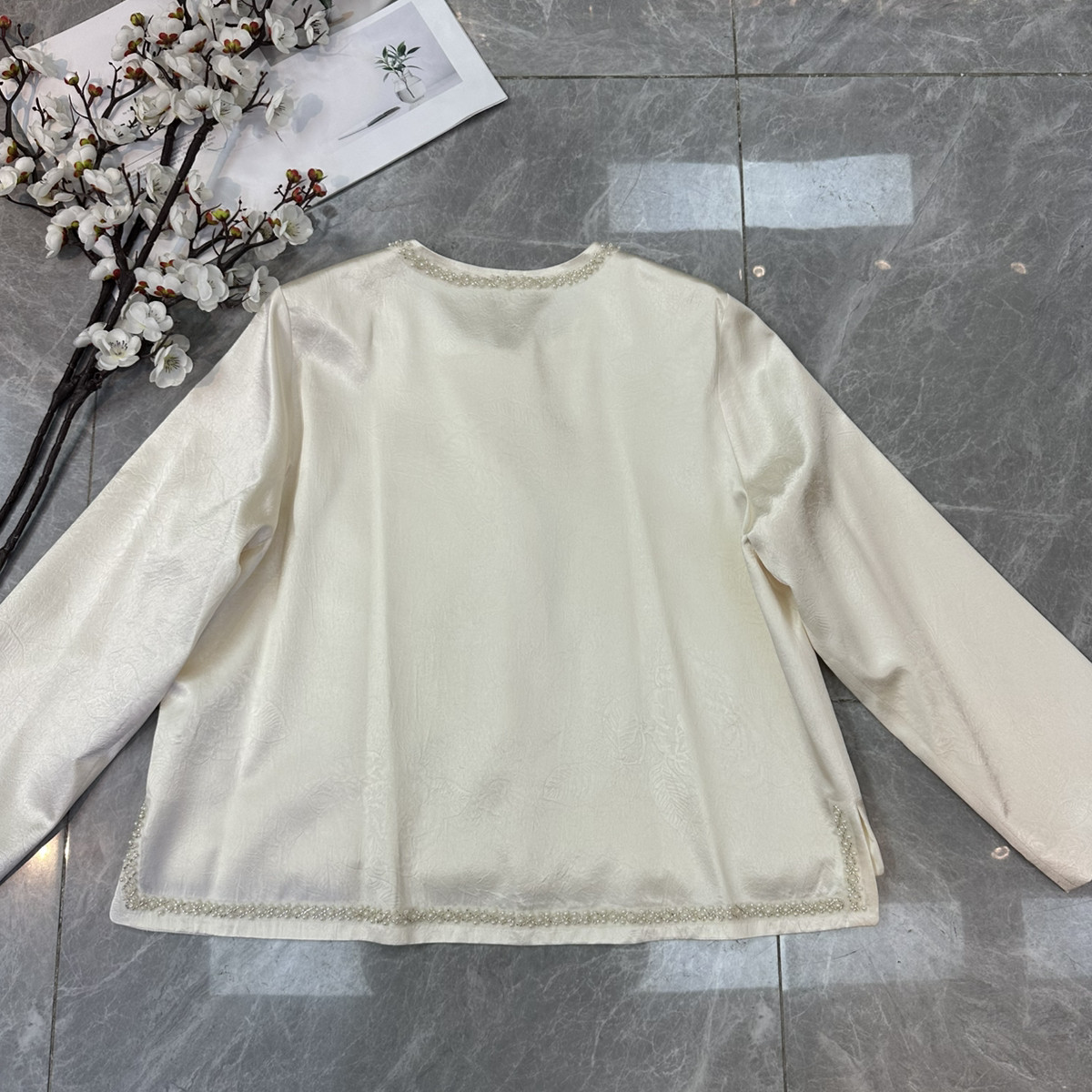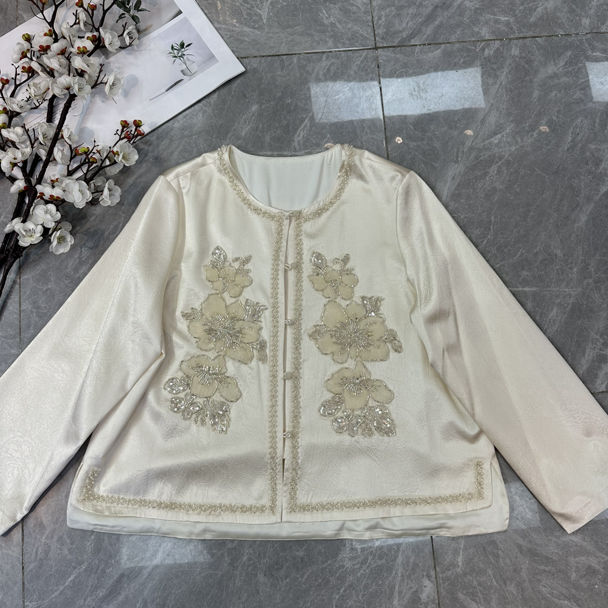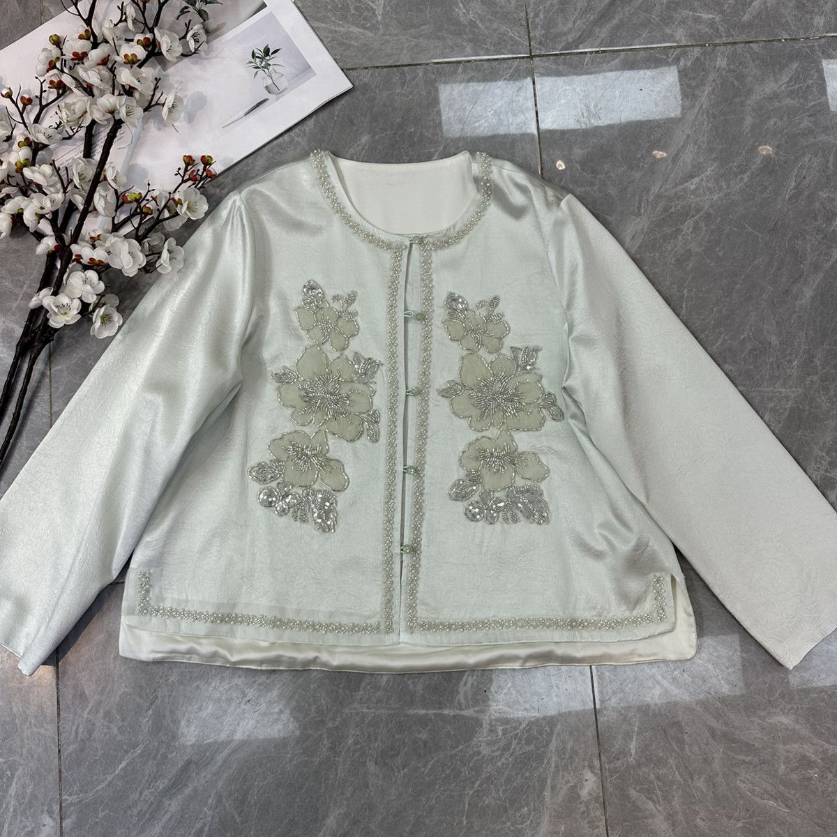 26年早春上新!醋酸压花面料贴珠花国风短外套