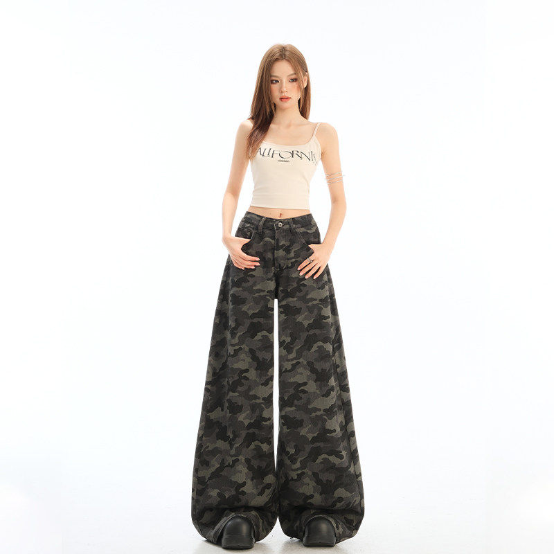 美式高街工装阔腿牛仔迷彩裤女小个子2025新款高腰显瘦宽松直筒裤