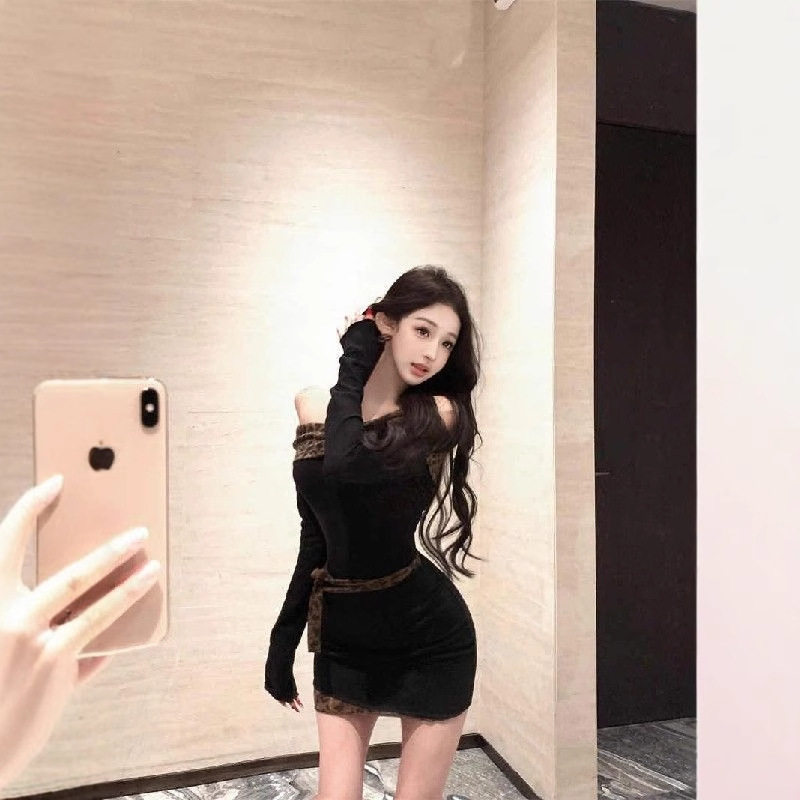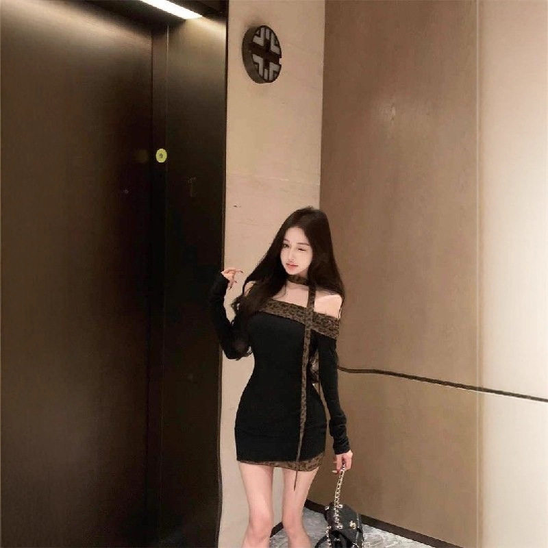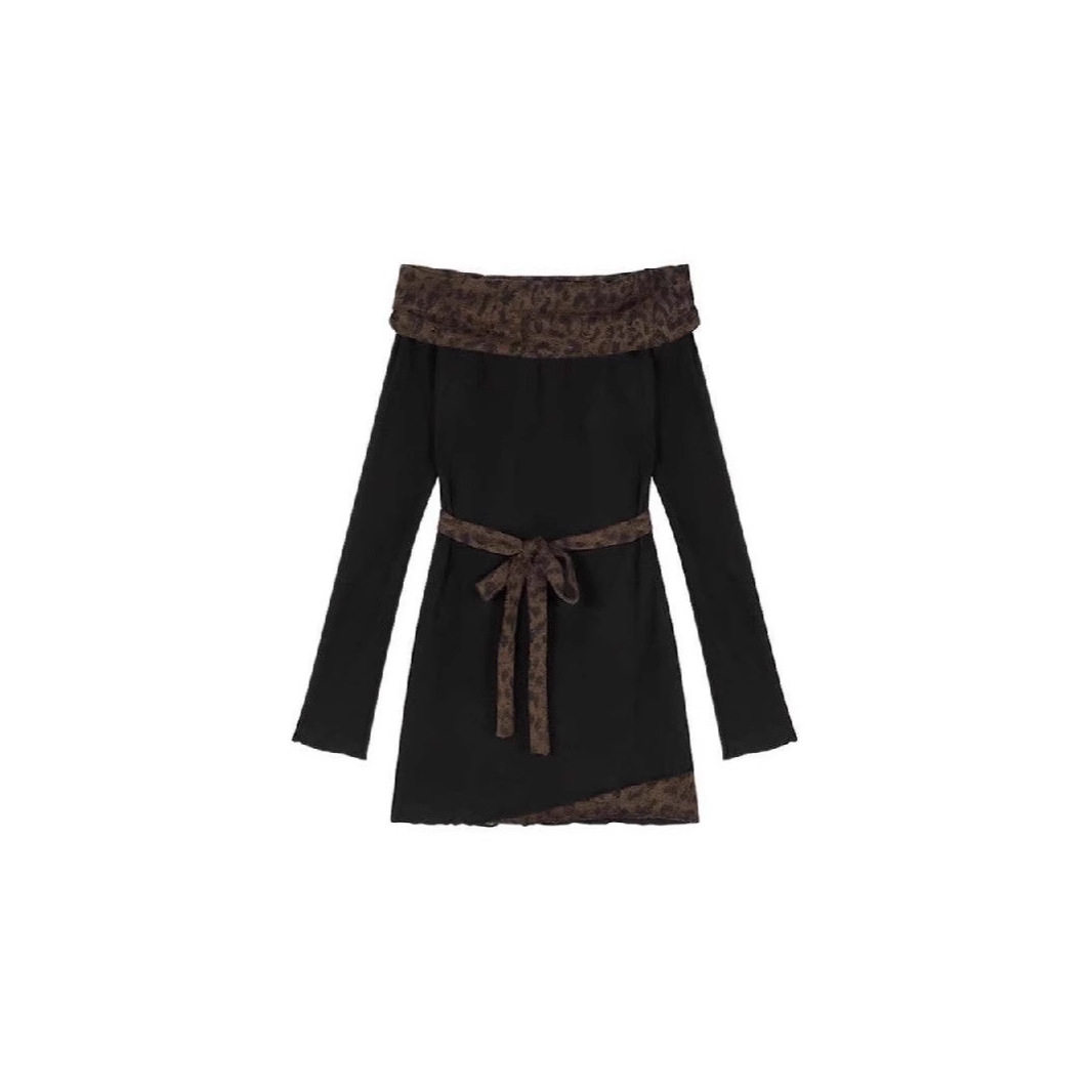 性感纯欲辣妹风豹纹拼接一字肩长袖连衣裙2026修身显瘦包臀短裙