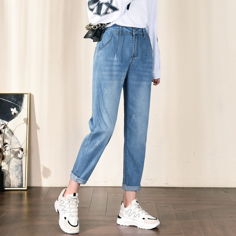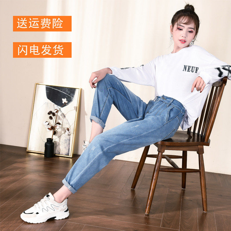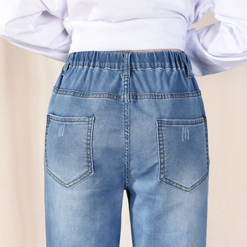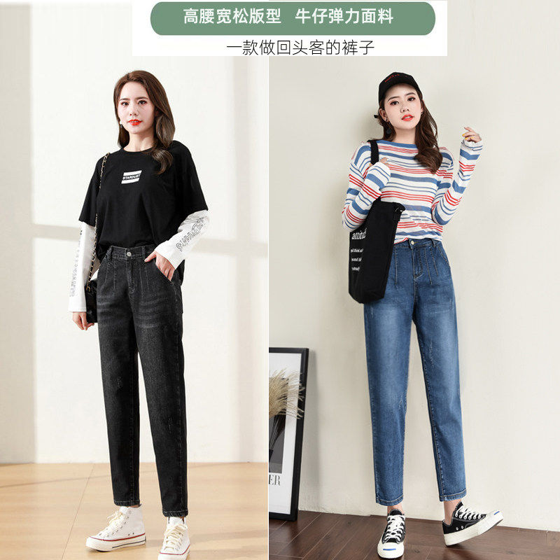 大尺码牛仔裤女胖mm高腰老爹裤显瘦宽松直筒松紧腰微胖哈伦女裤子