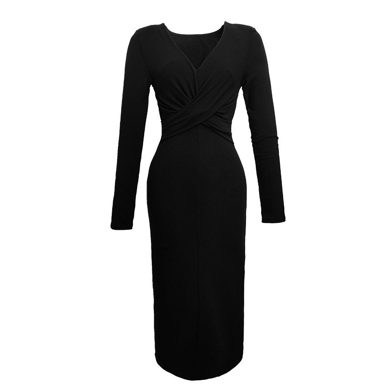 2025秋装新款女人味气质V领扭结收腰显瘦包臀连衣裙打底长裙5561