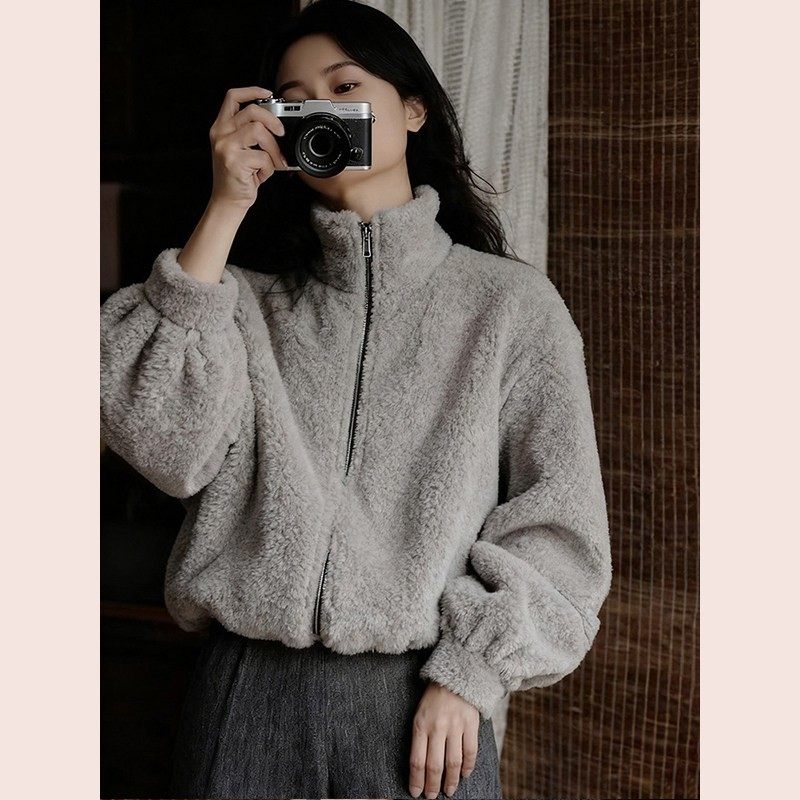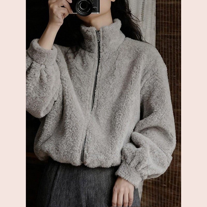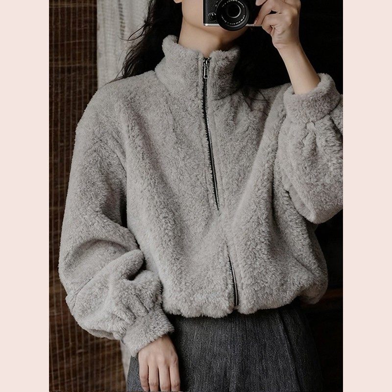 复古灰色仿貂绒立领毛毛拉链外套慵懒风高级软糯短夹克衫2025冬季