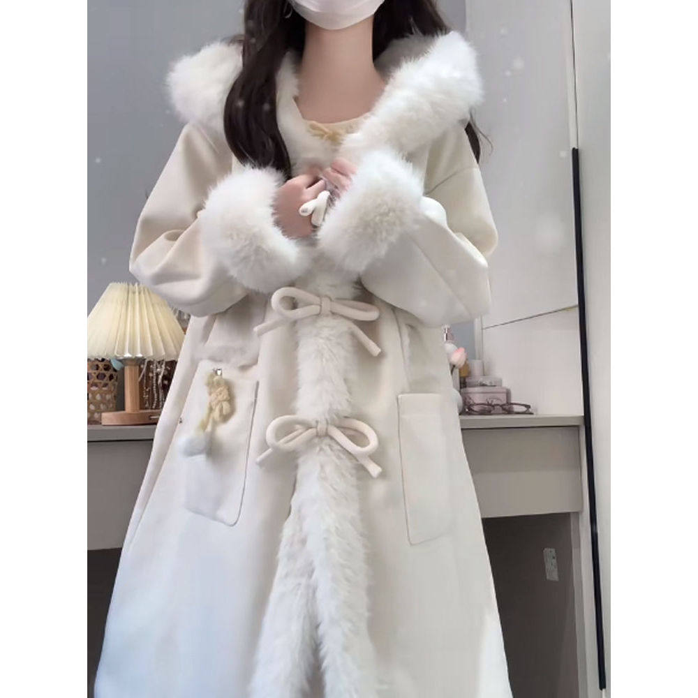 天山暮雪 冬装新款甜美气质连帽毛领设计蝴蝶结扣学院风毛呢大衣