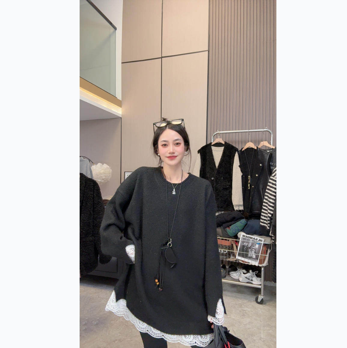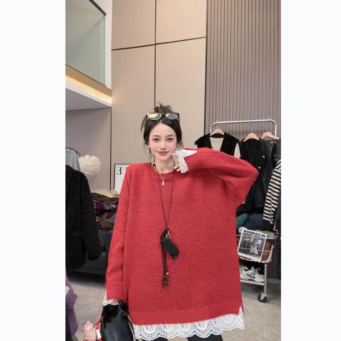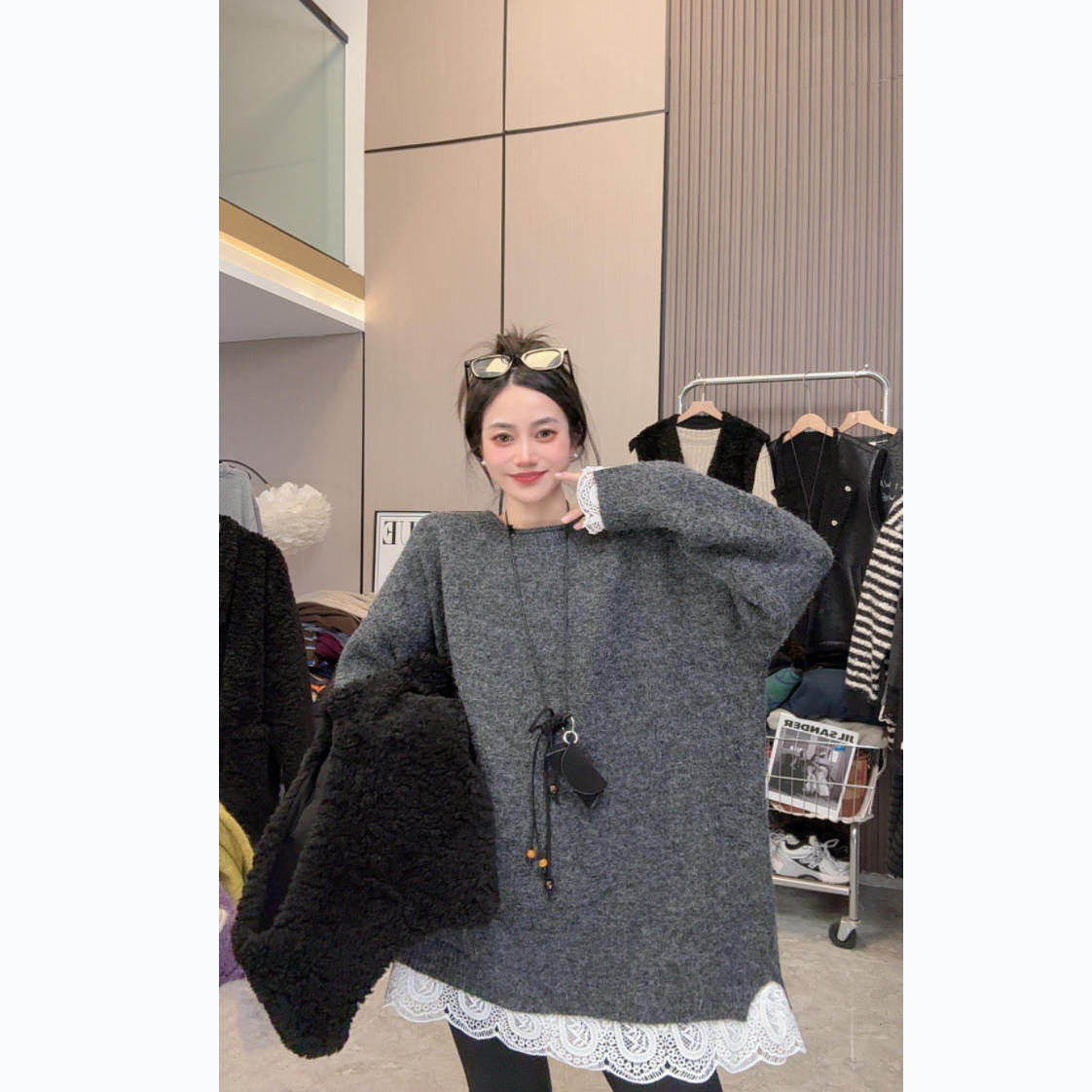 【一眼沦陷】温柔蕾丝~秋冬上新蕾丝拼接圆领针织中长款长袖毛衣