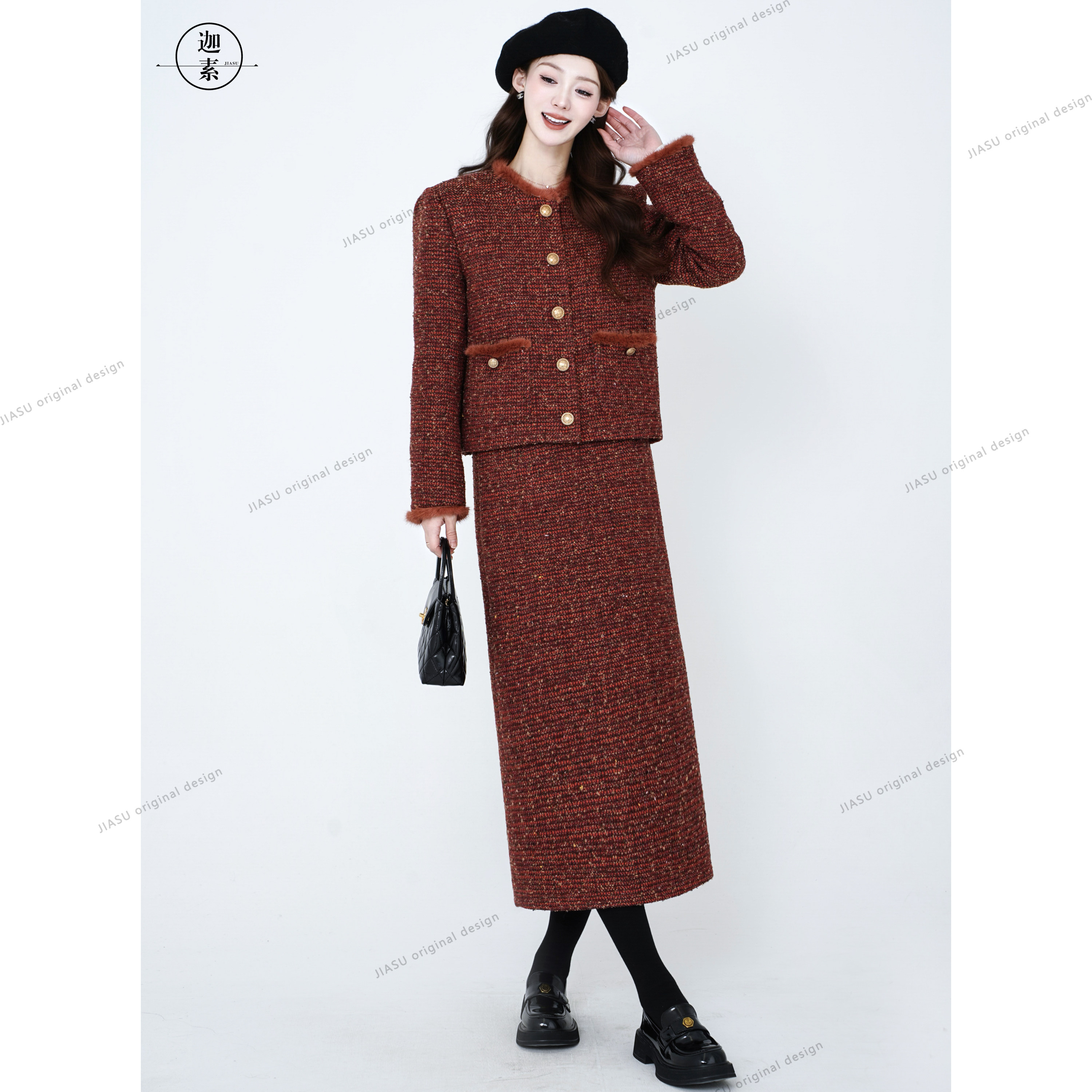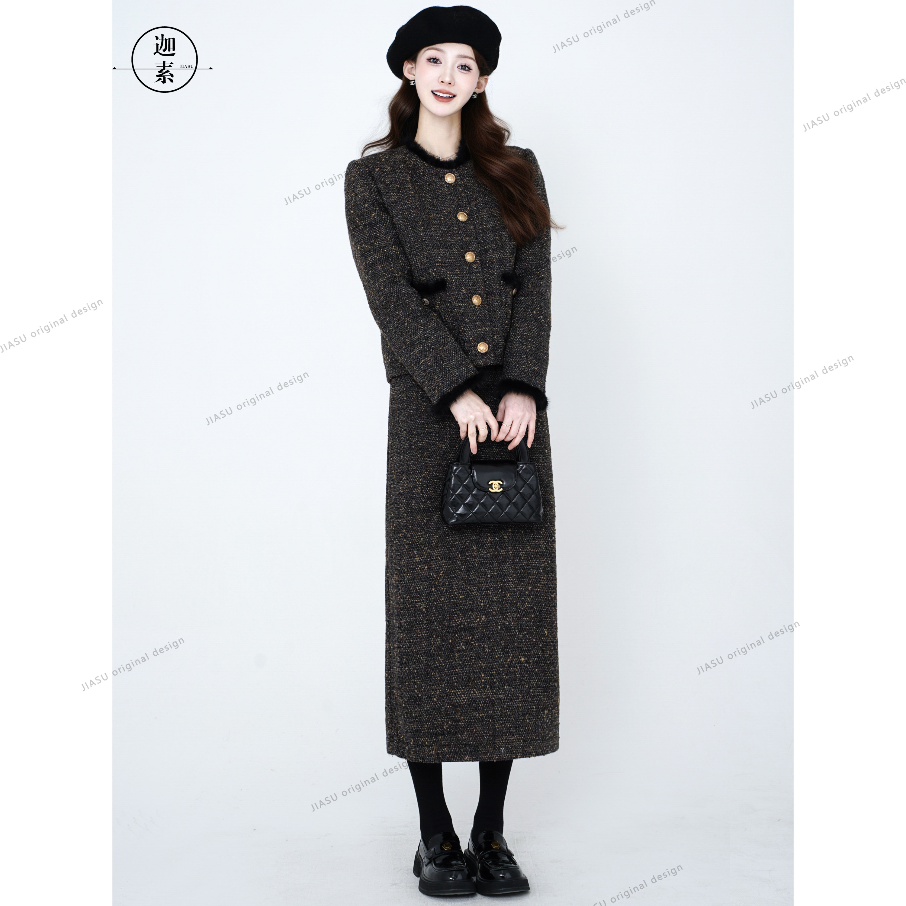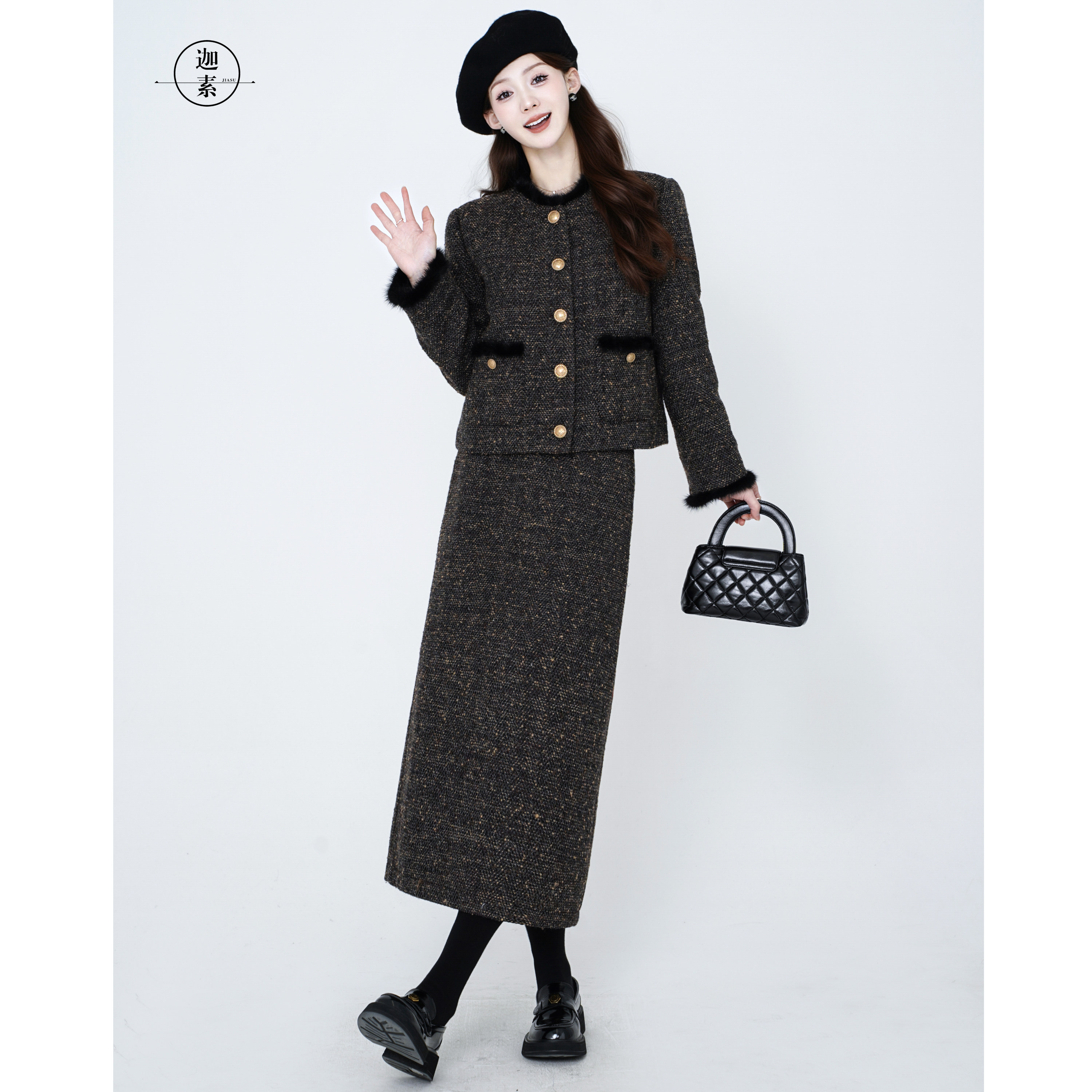 JIASU 【暖纱织梦】20羊毛定制粗花呢羊毛小香风羽绒套装S600
