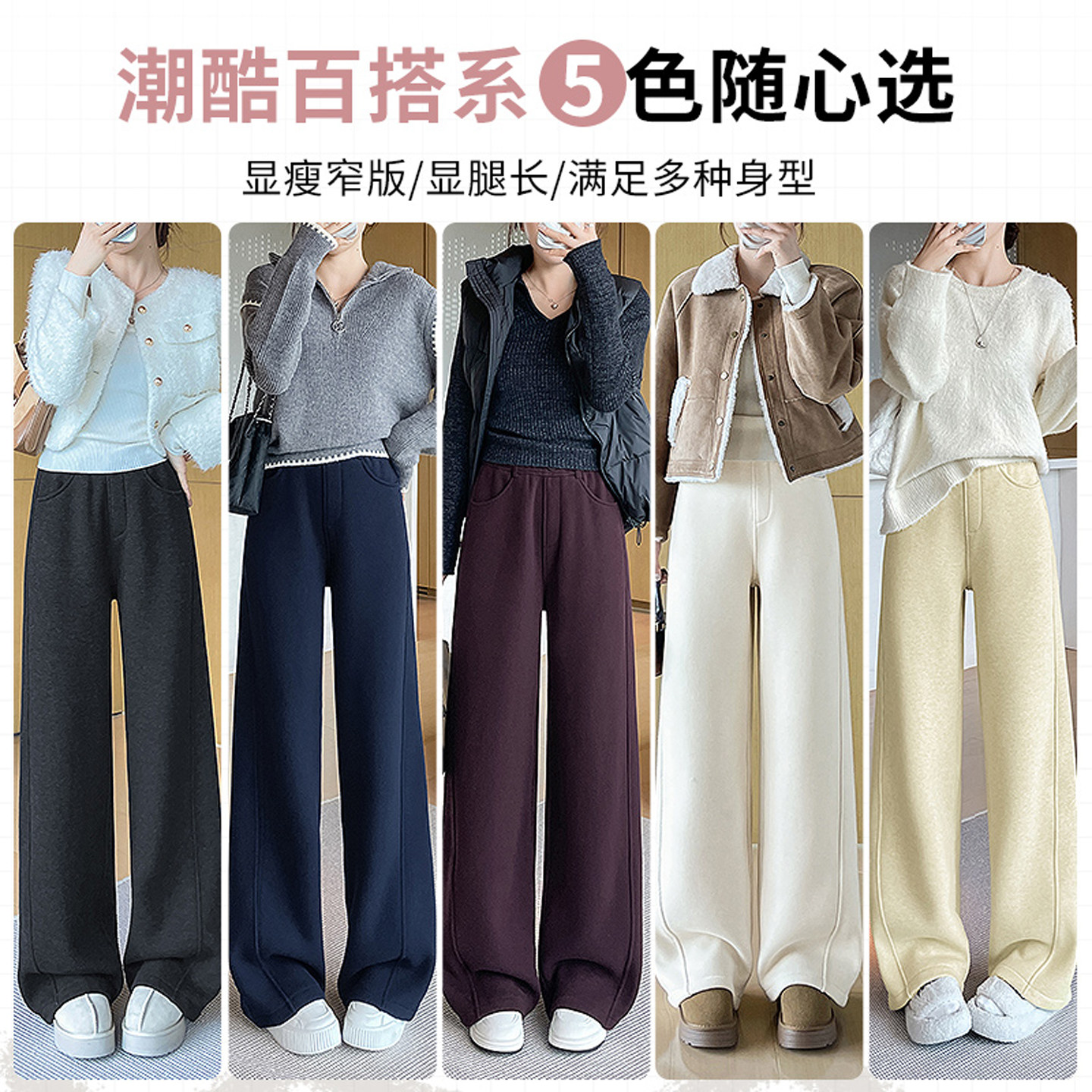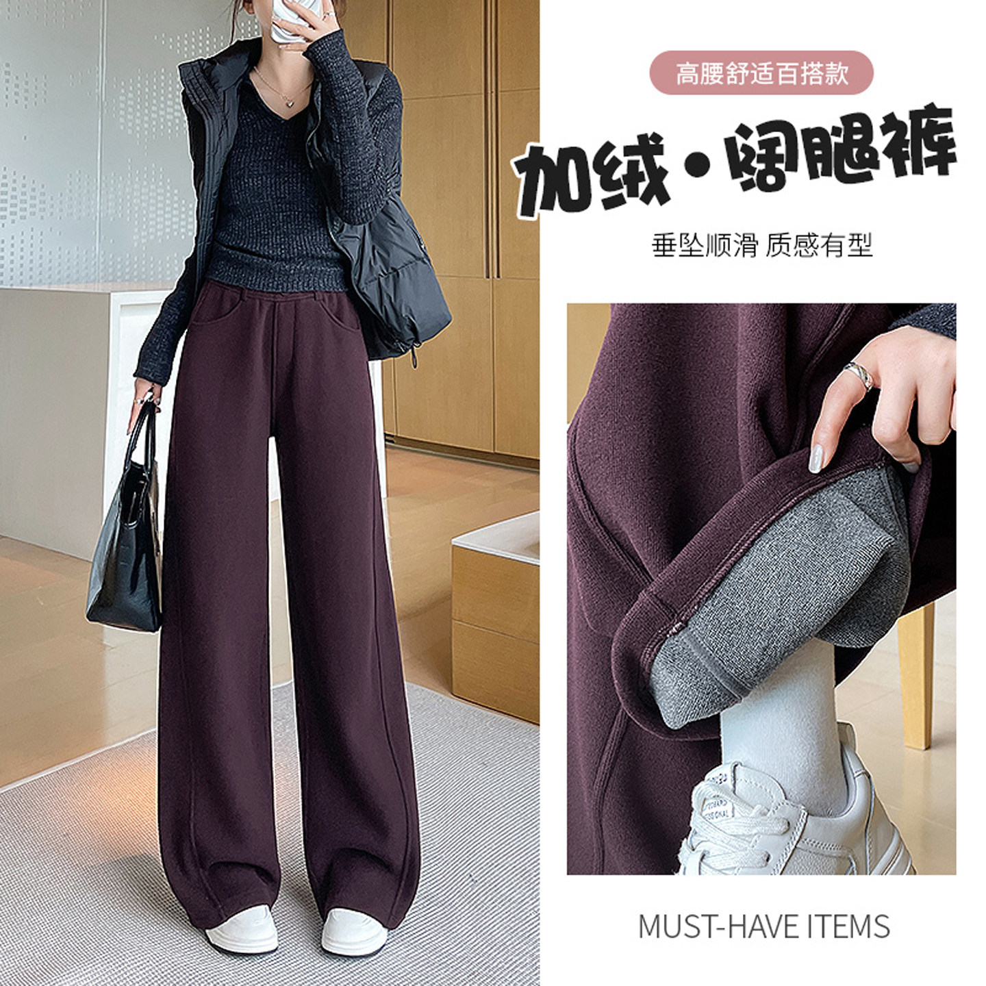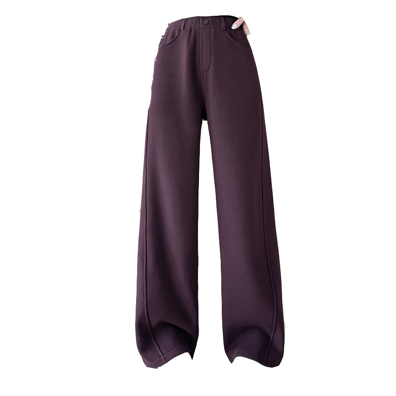 首页> 女装> 酒红色加绒毛呢阔腿裤女2025年秋冬新款宽松显瘦休闲弯刀香蕉裤子