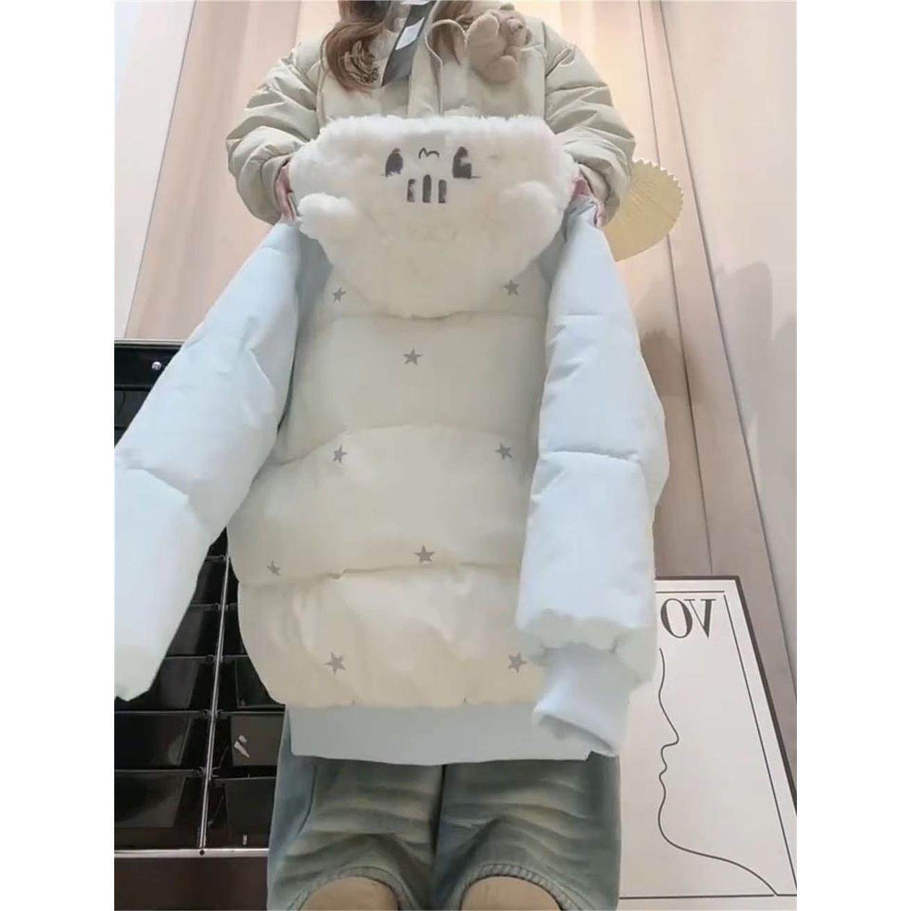 日系学院风冬日新款氛围感蓝色连帽棉服设计感小猫刺绣保暖棉衣女