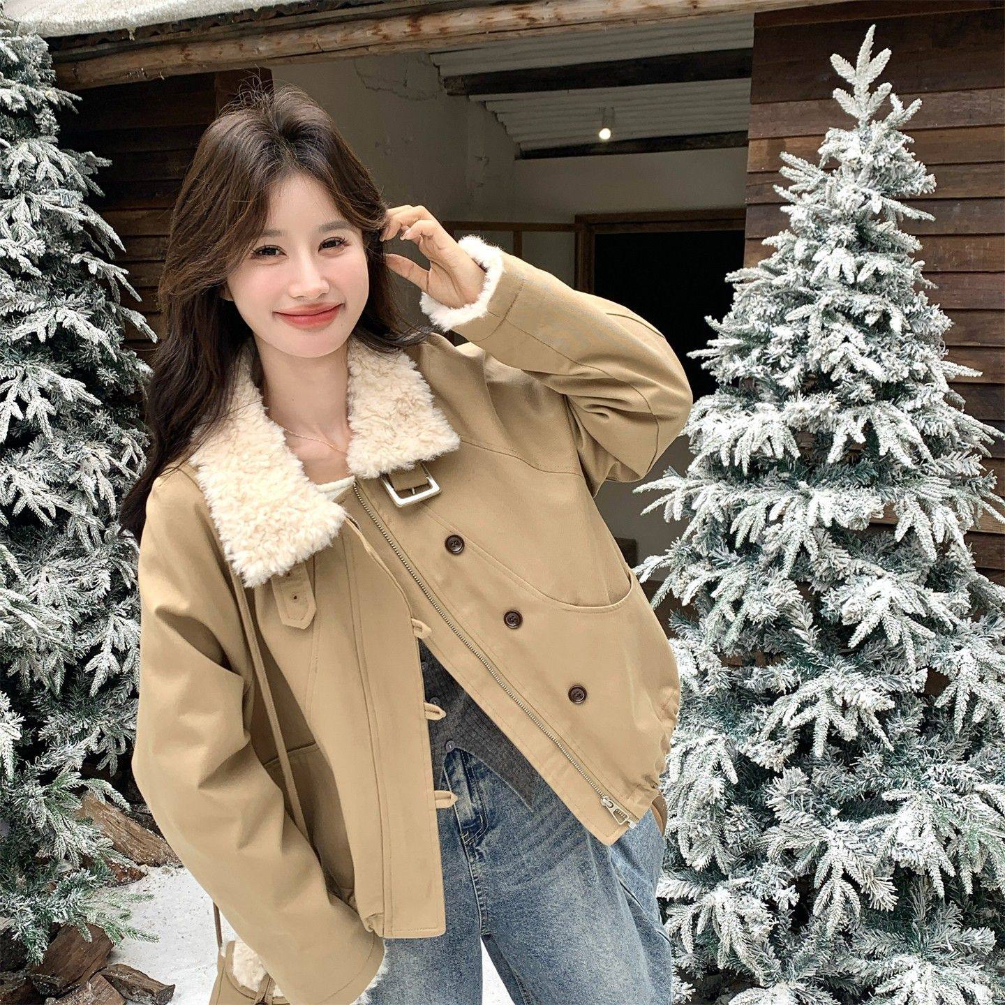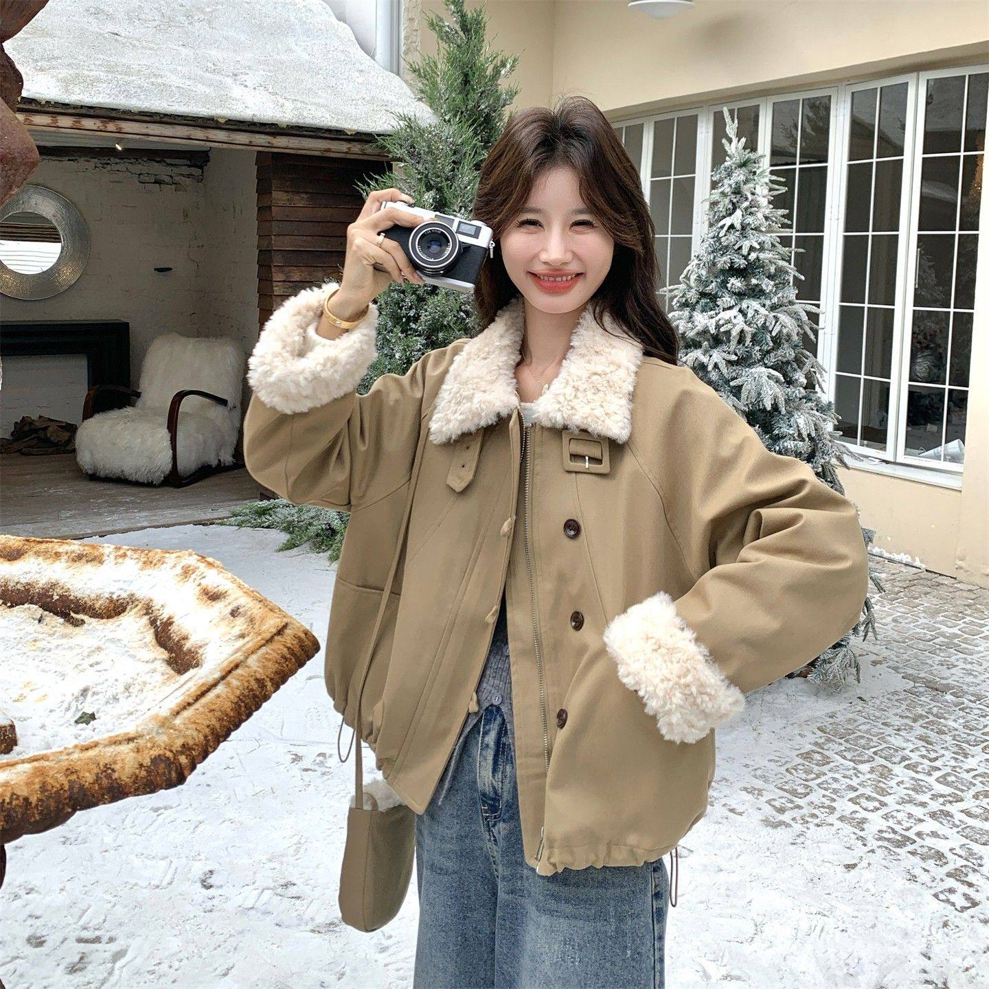 卡其色羊羔毛拼接工装风羽绒服女韩系冬季新款盐系设计感加厚外套