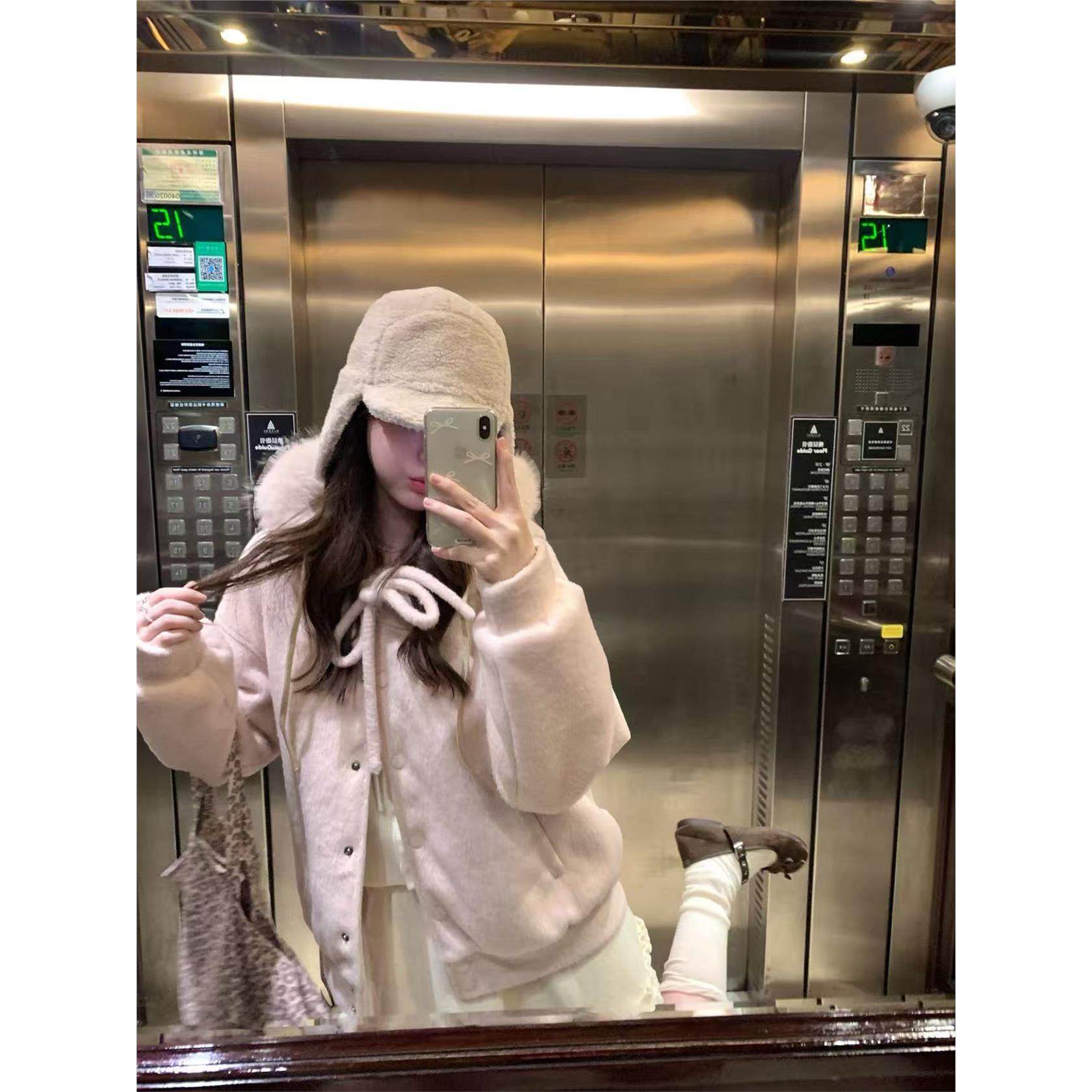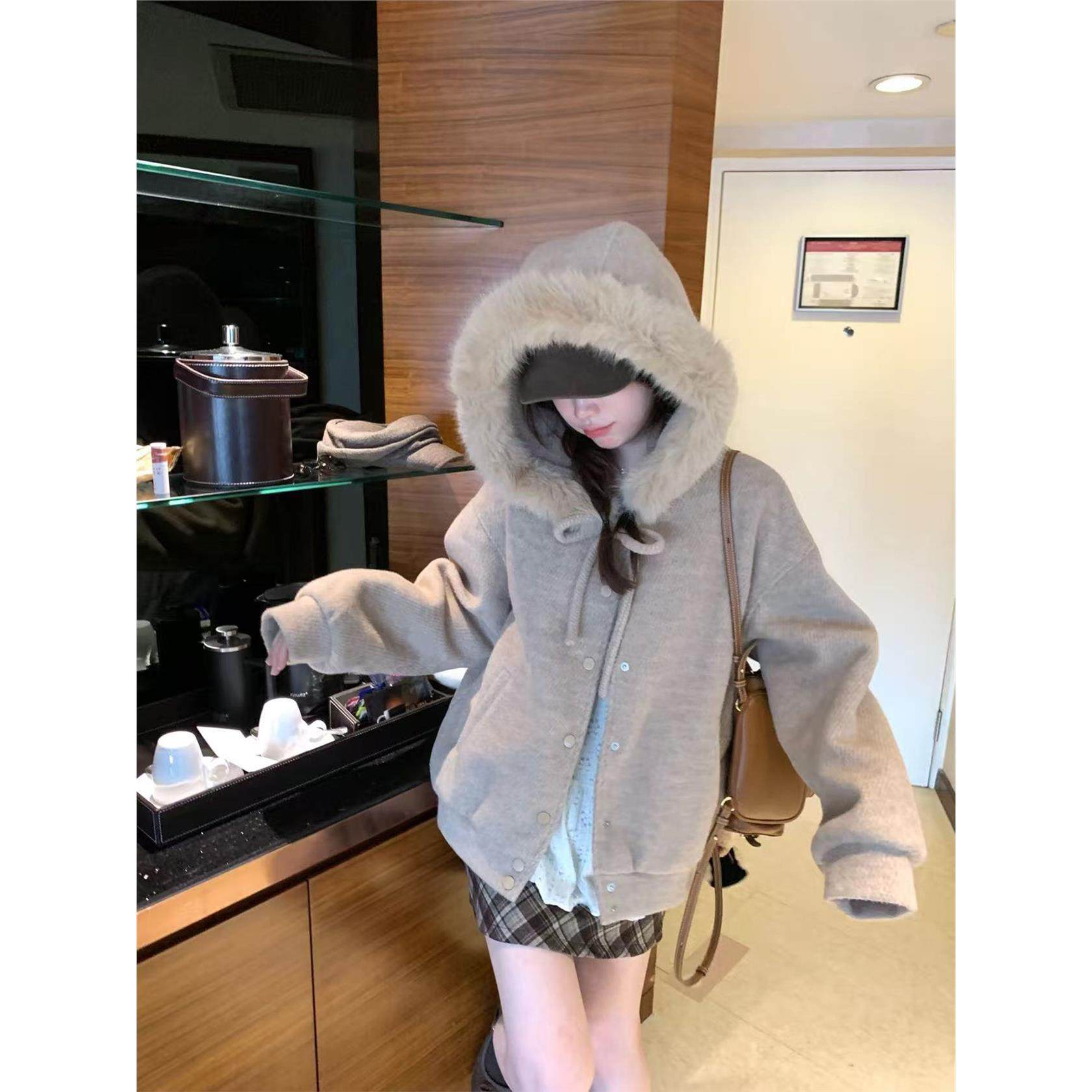 燕麦暖绒蝴蝶结绑带毛领连帽毛呢厚外套女冬季加厚高级感棉服冬装