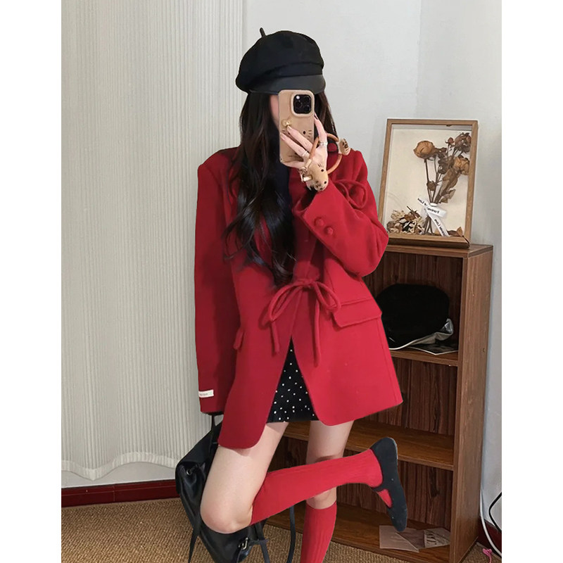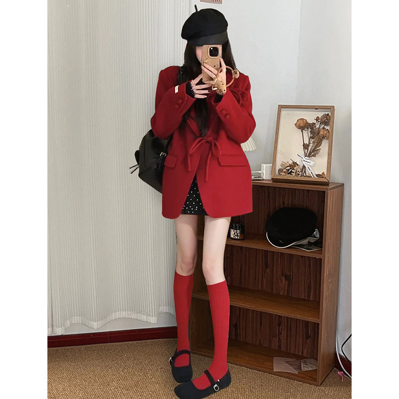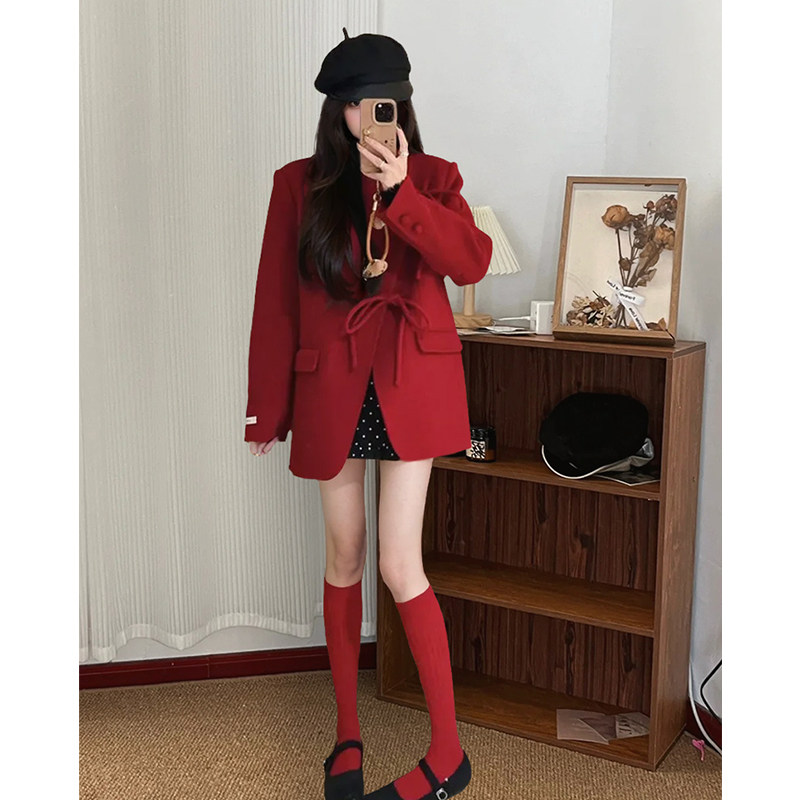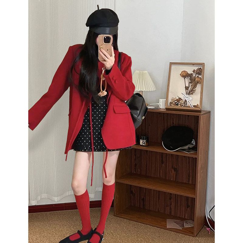 名媛风气质蝴蝶结宽松百搭红色外套显瘦波点半身裙千金感洋气套装