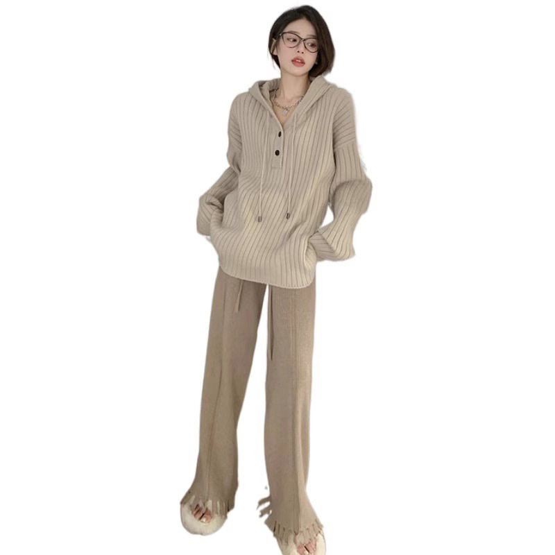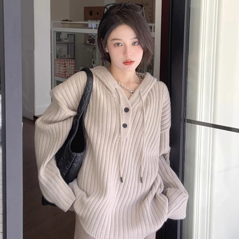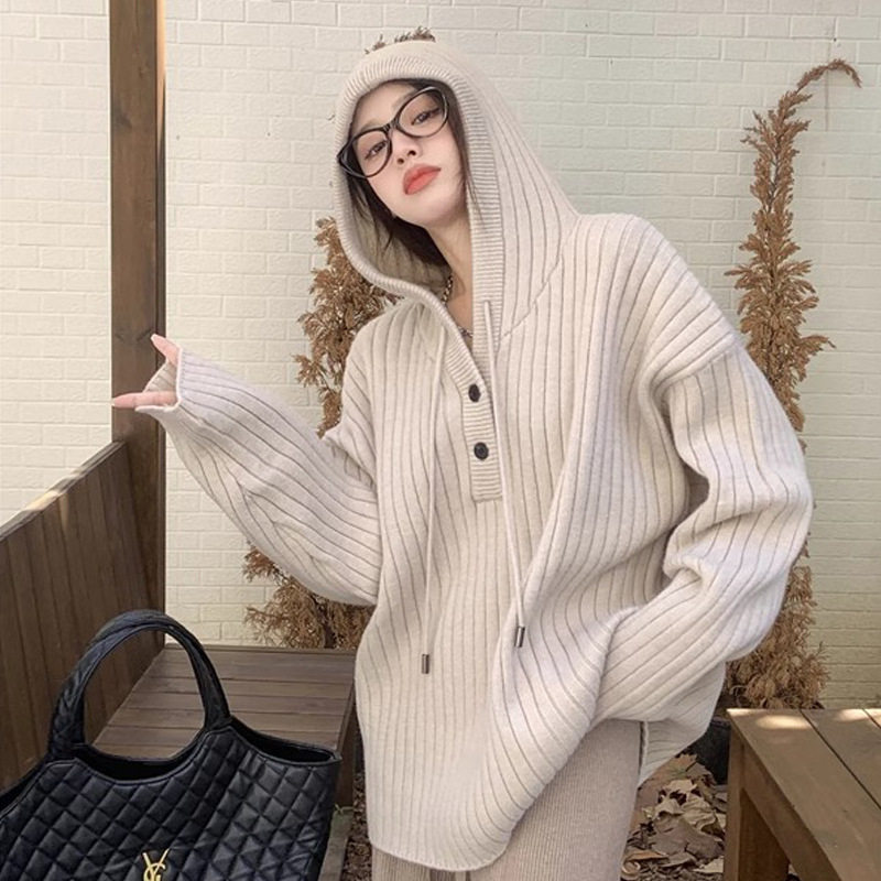 大码女装秋冬韩版软糯慵懒风连帽毛衣宽松百搭套头长袖针织衫上衣