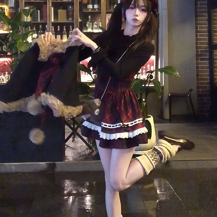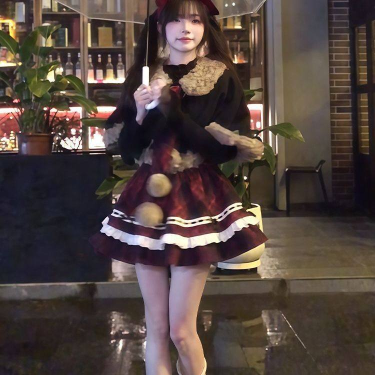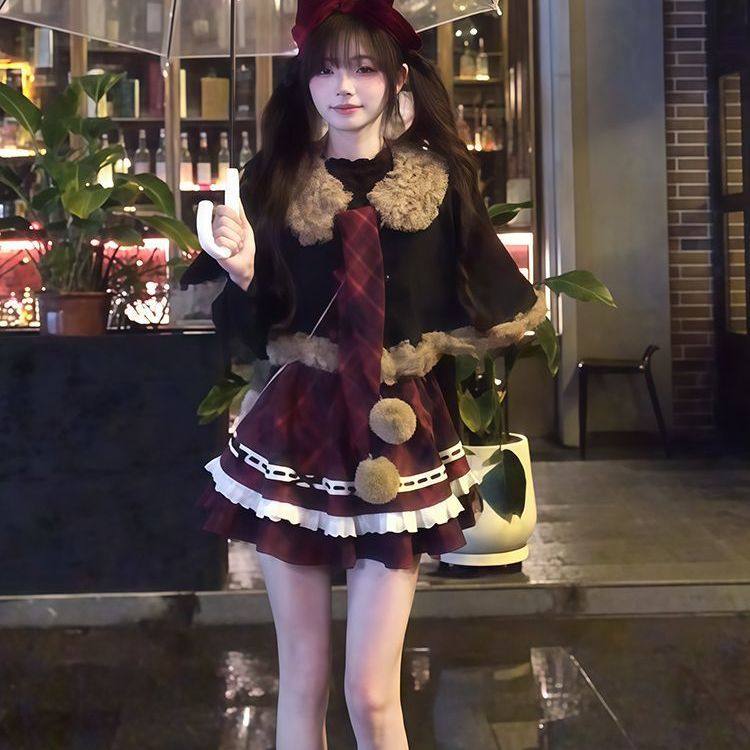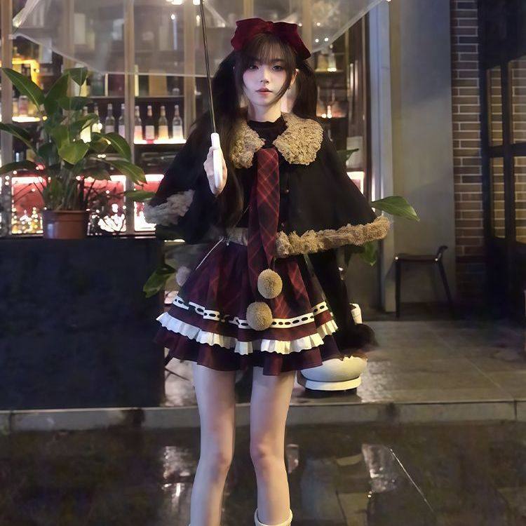 圣诞氛围感穿搭秋冬复古学院风收腰假两件连衣裙+披肩斗篷两件套
