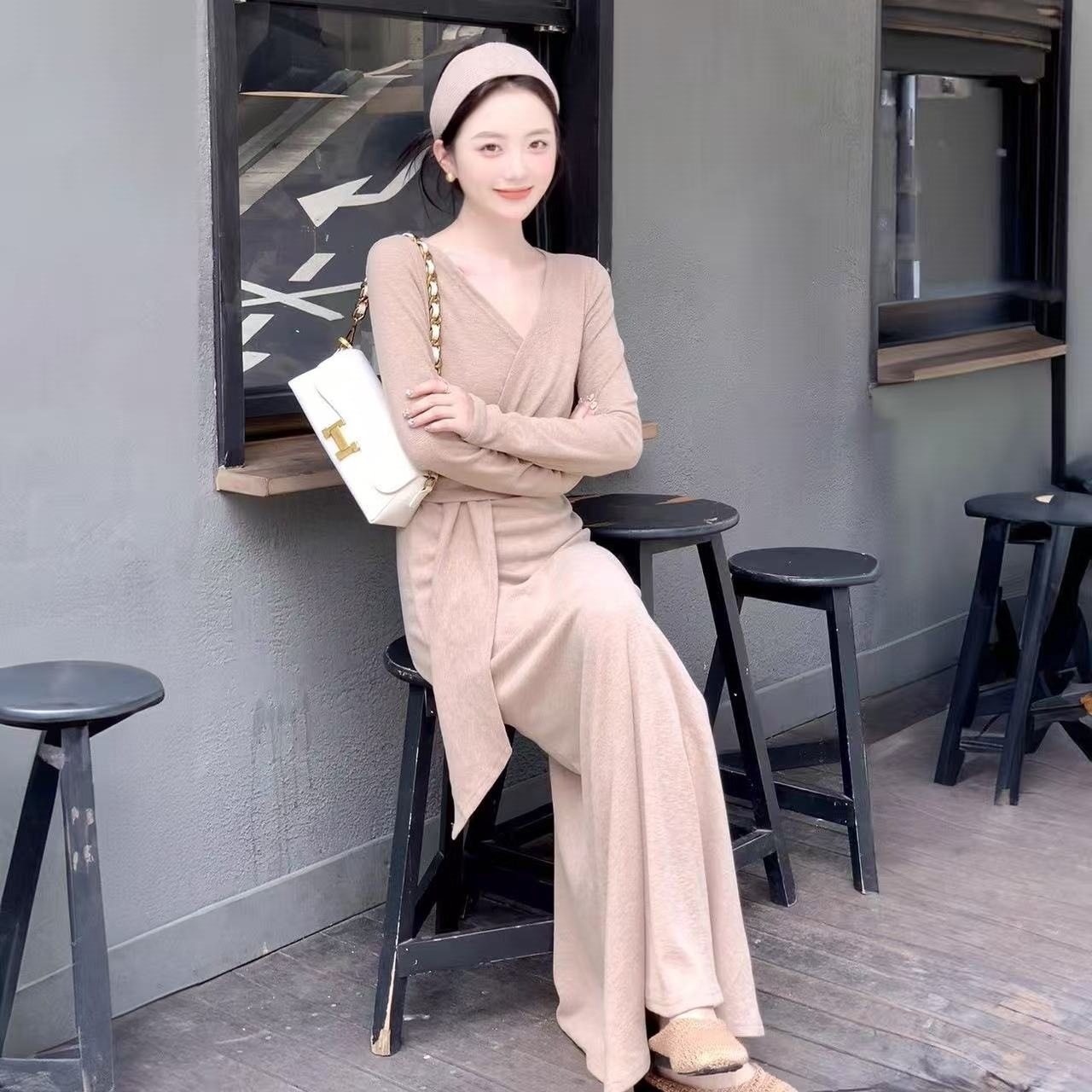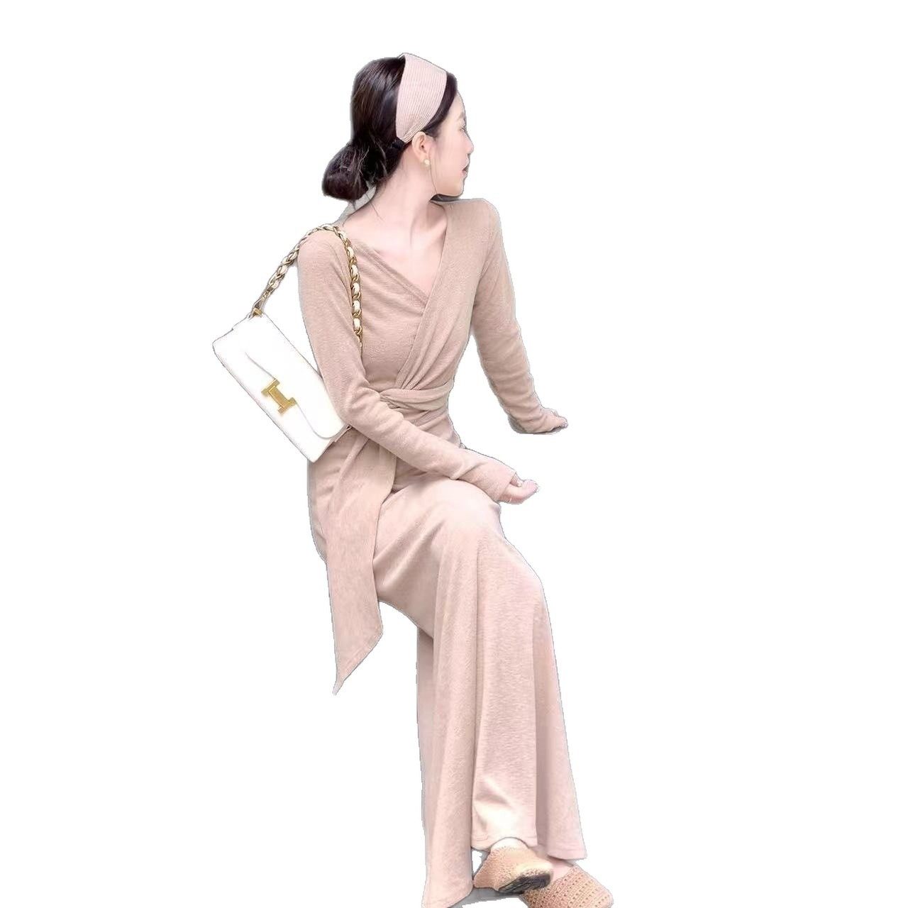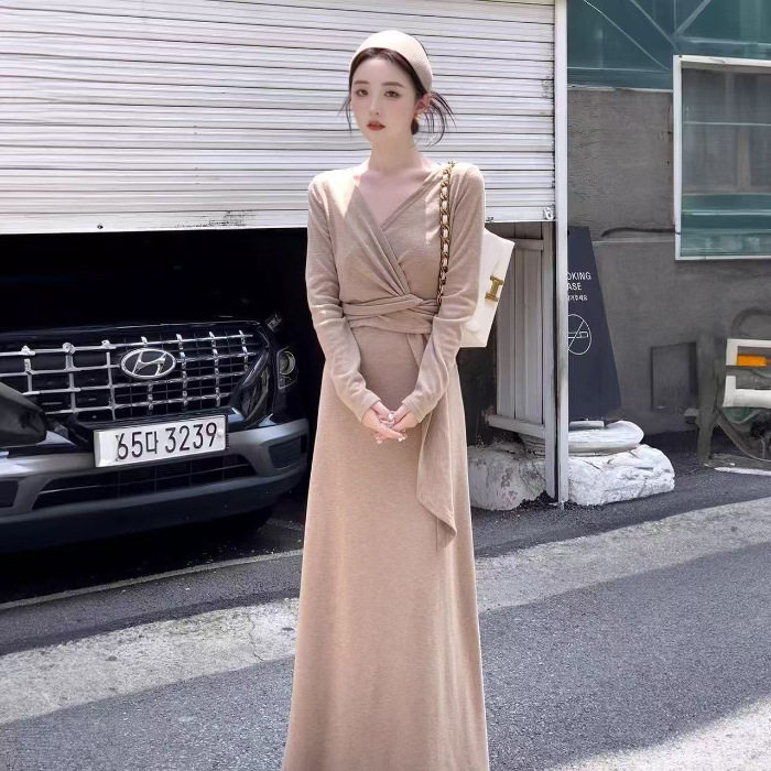 气质绑带咖色v领纽结连衣裙女秋季新款纯欲风收腰显瘦长裙子
