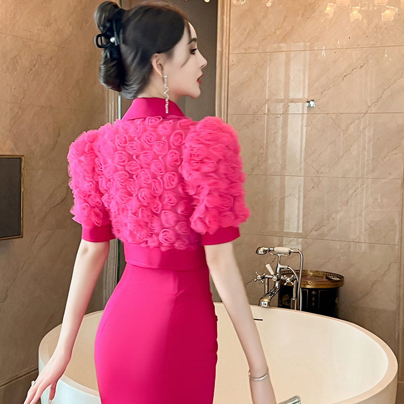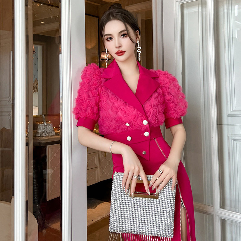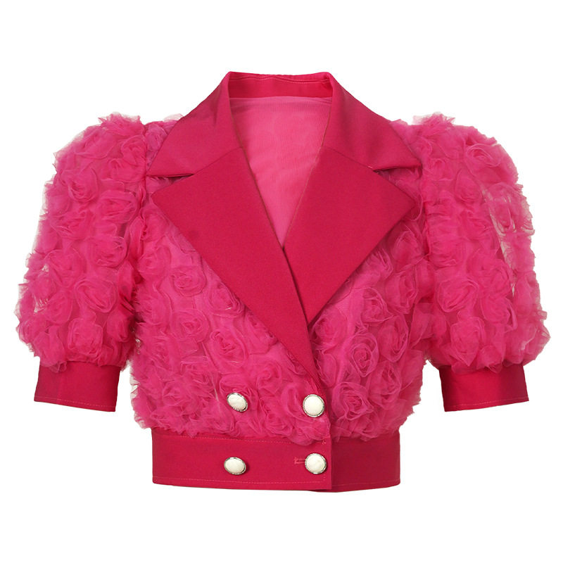 2024夏季新款小香风西装方领立体玫瑰花网纱上衣短款小外套50202