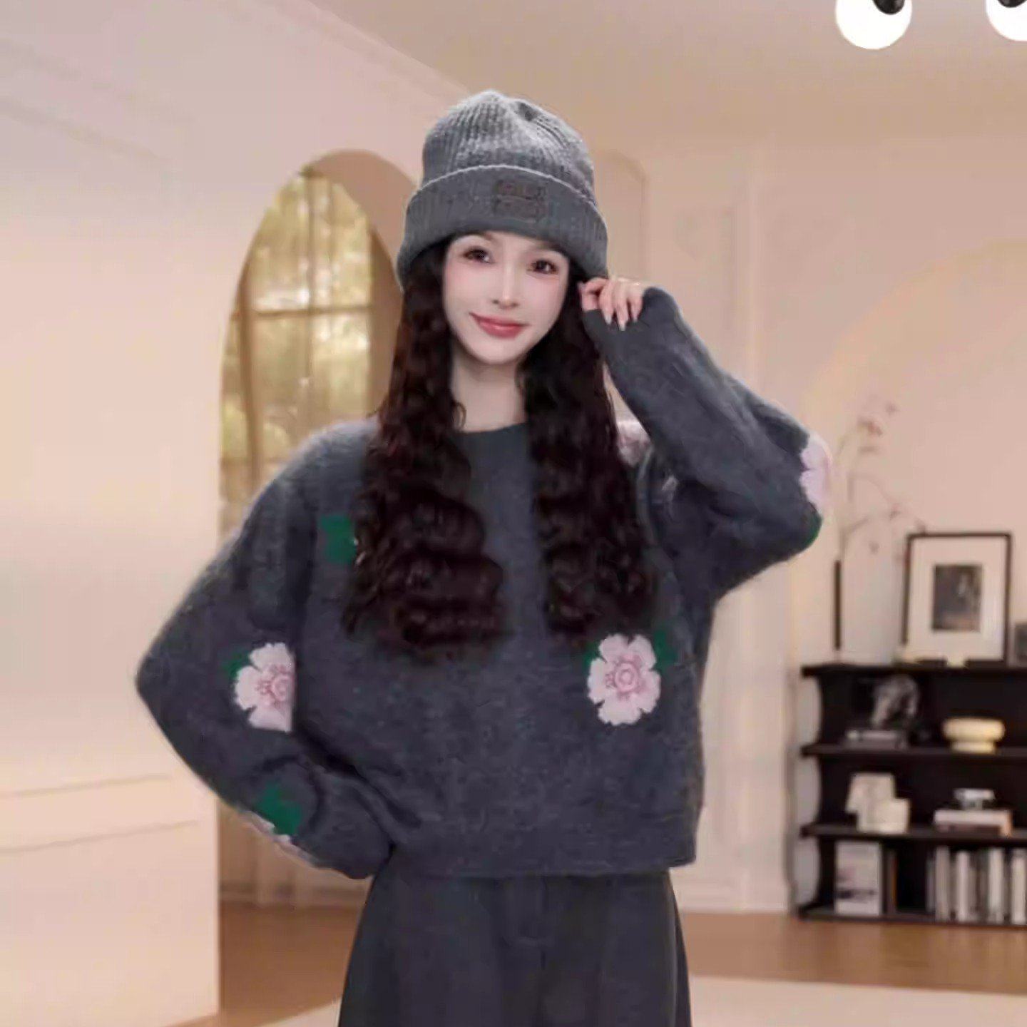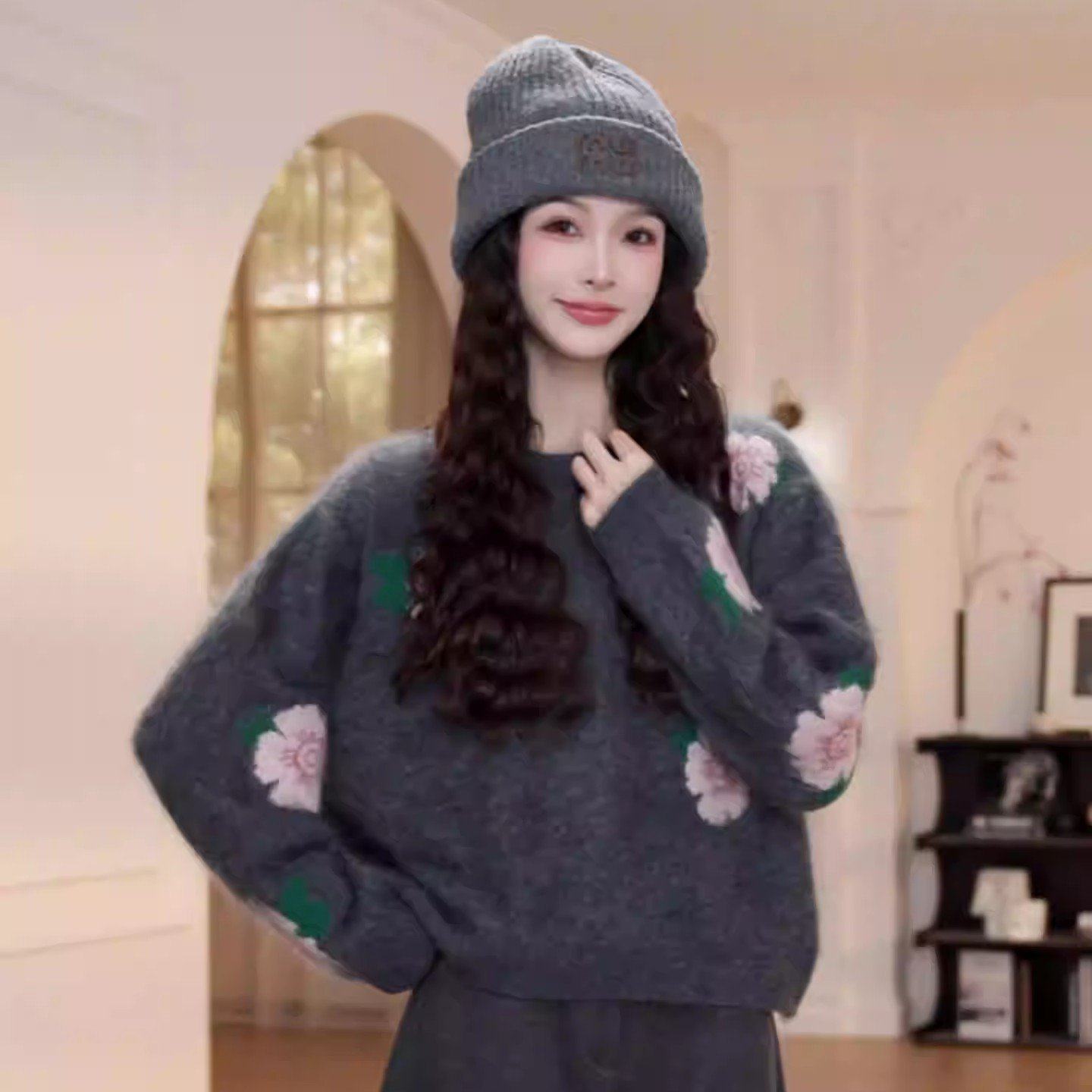 圆领套头花朵毛衣女秋冬季新款慵懒风长袖针织衫9208