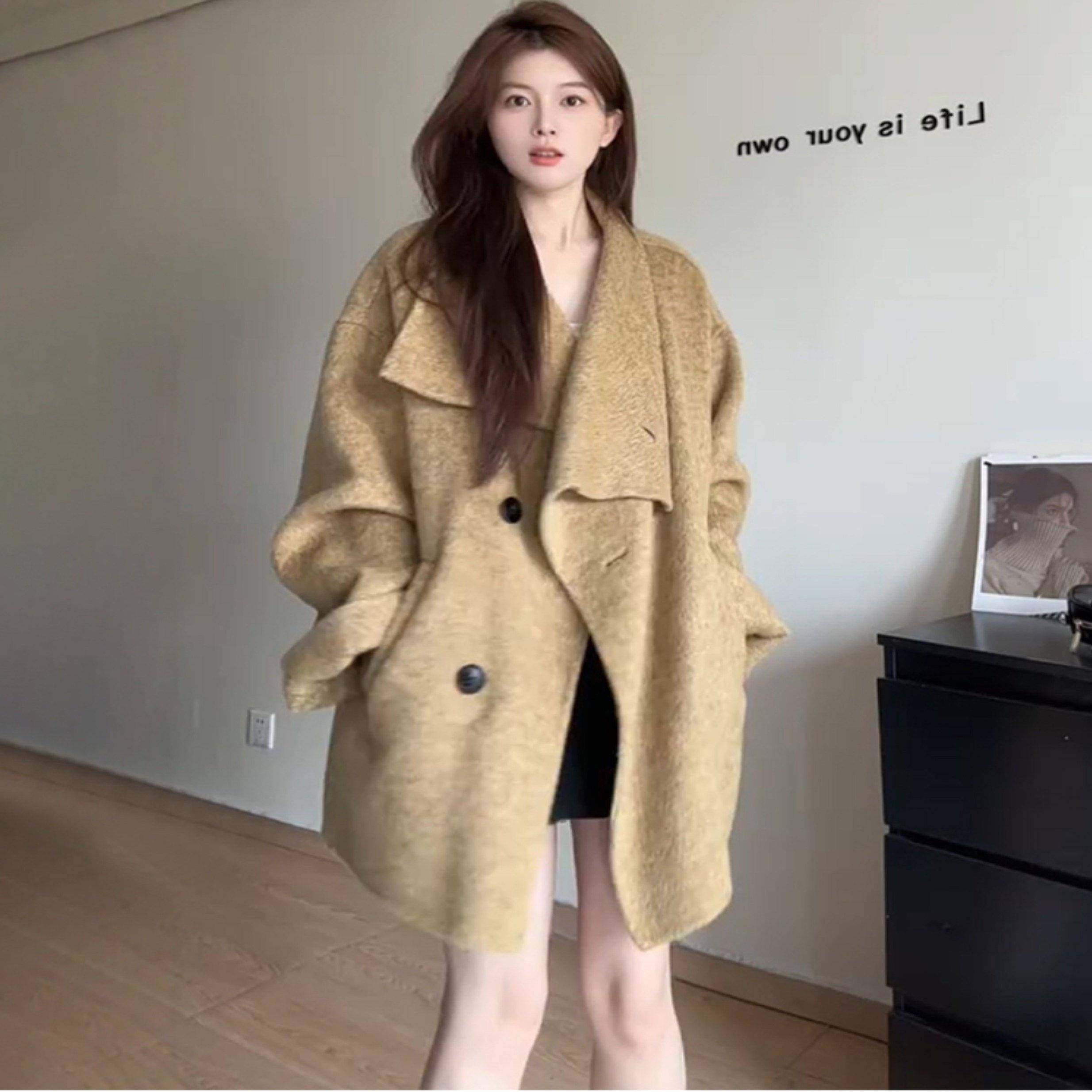 香港韩系高级感黄色翻领呢子大衣女秋季大码胖mm宽松百搭毛呢外套