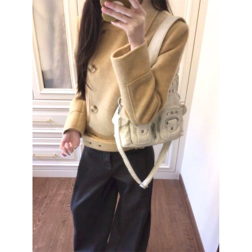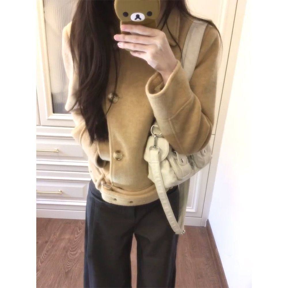 翻领双排扣毛呢大衣气质简约静奢感腰带设计短款外套小个子外套
