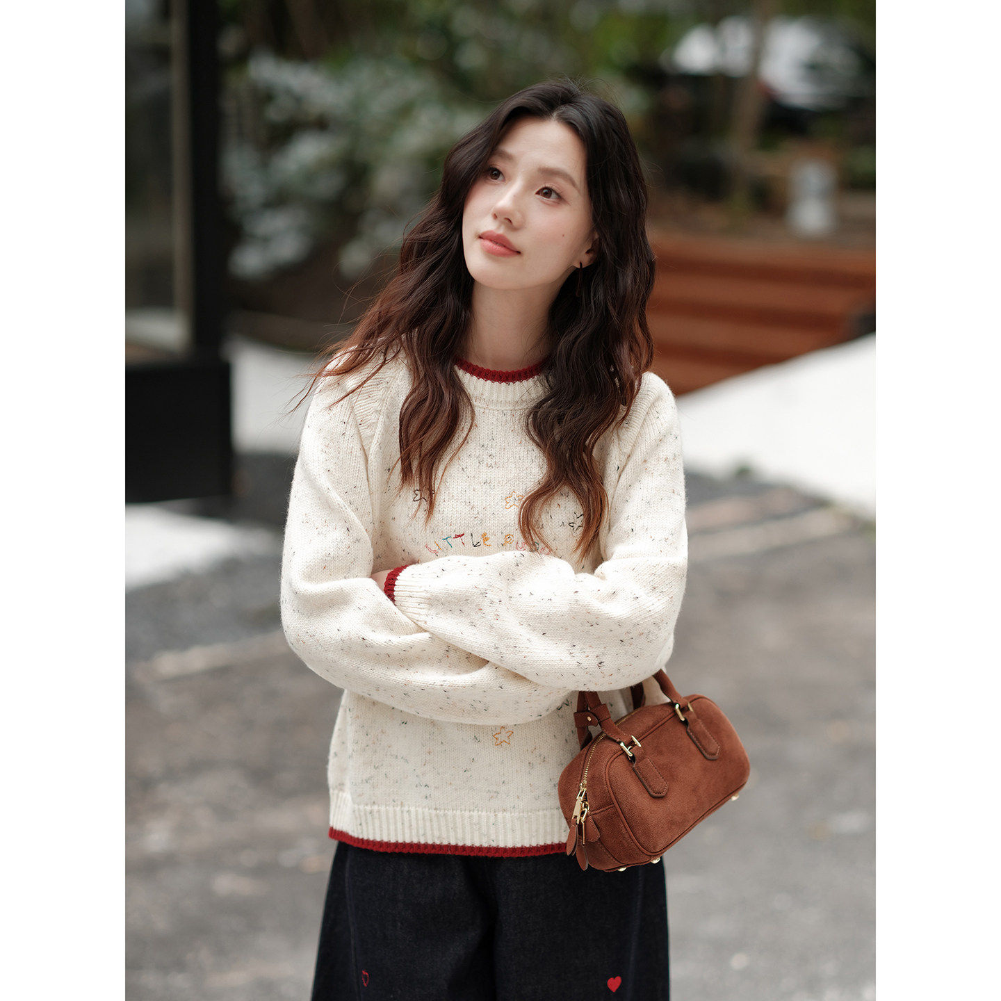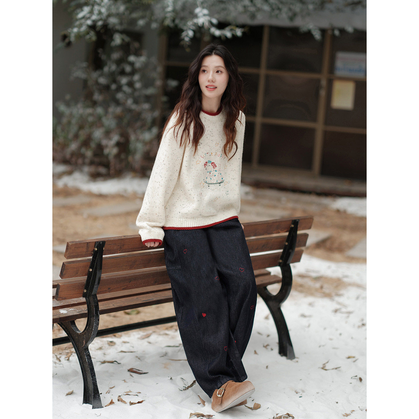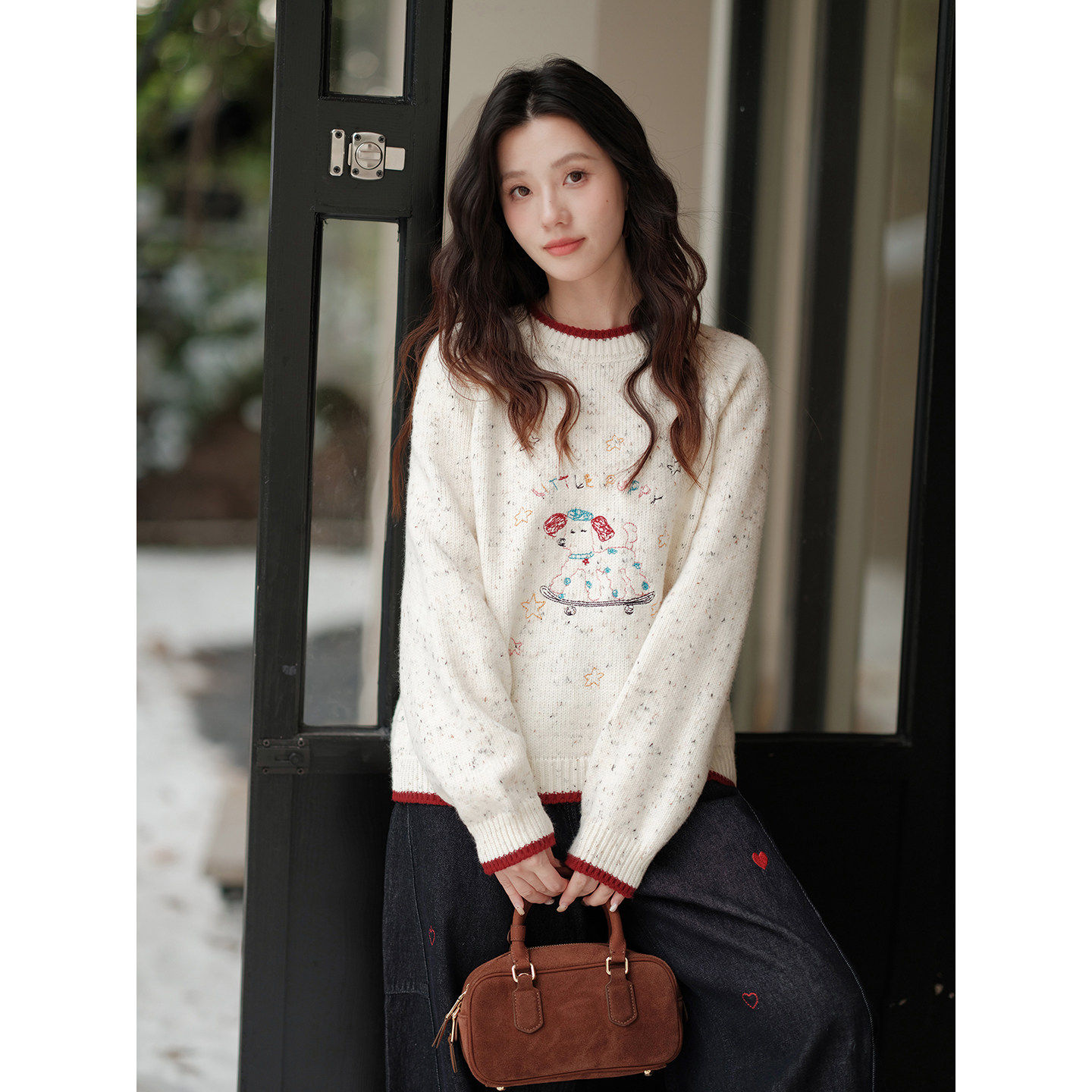 木易易圣诞氛围感毛衣宽松内搭上衣女冬季卡通刺绣撞色小狗针织衫