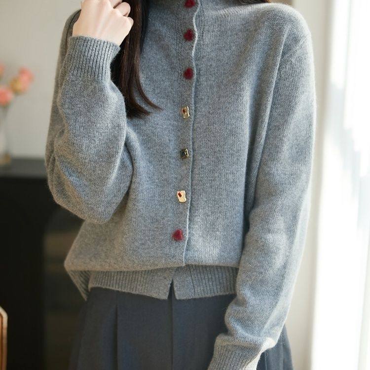 秋冬羊毛衫立领提花针织开衫宽松显瘦加厚简约大码毛衣外套女外穿
