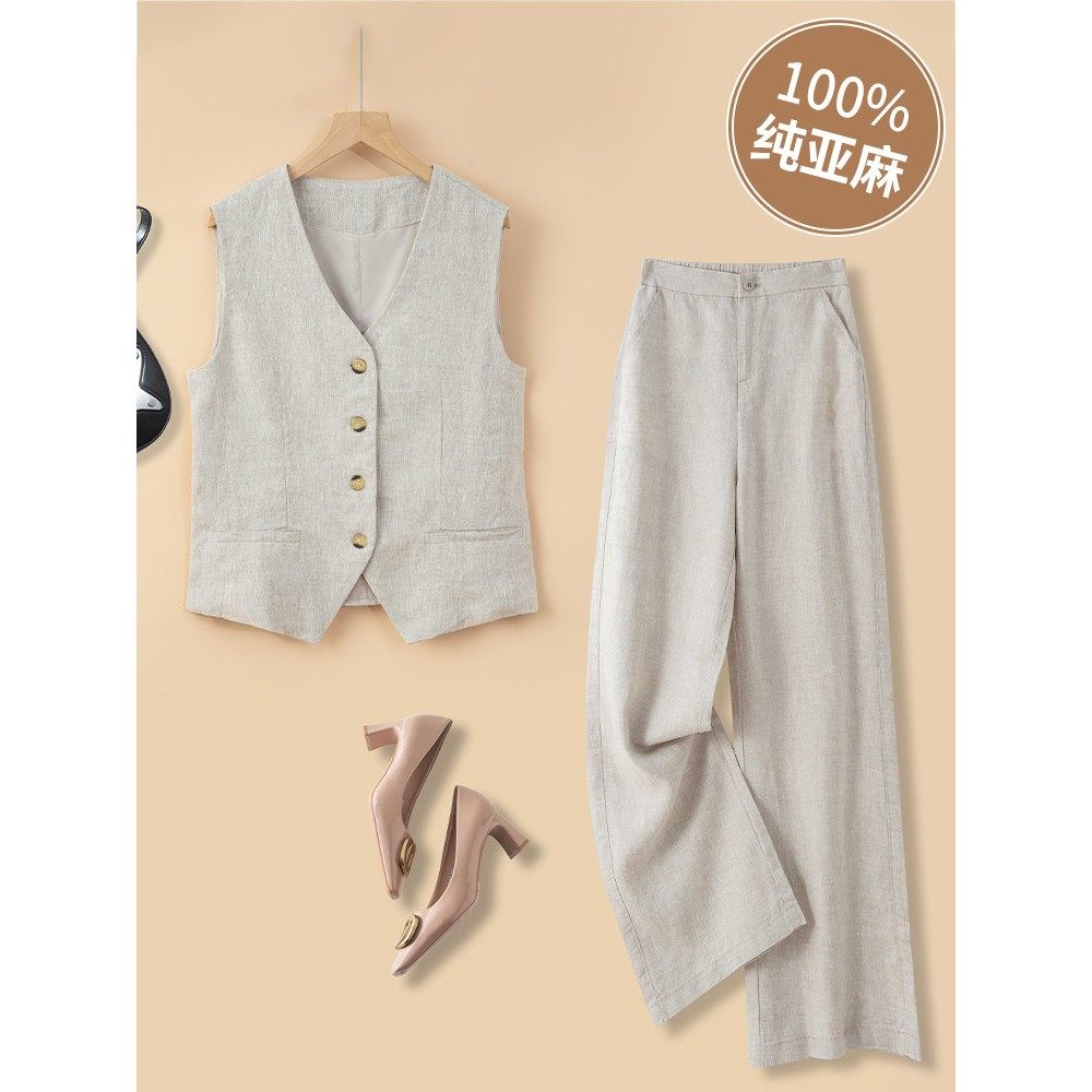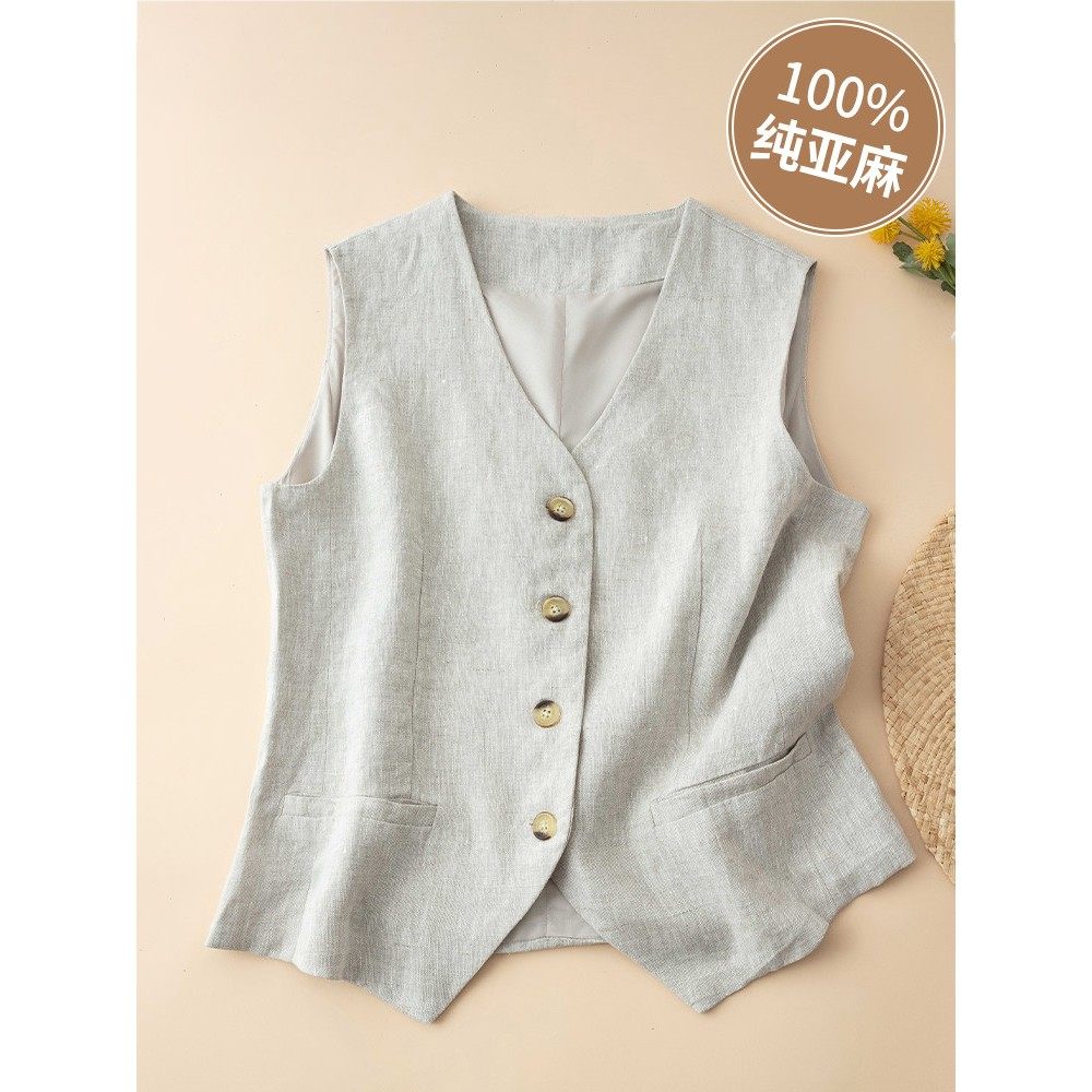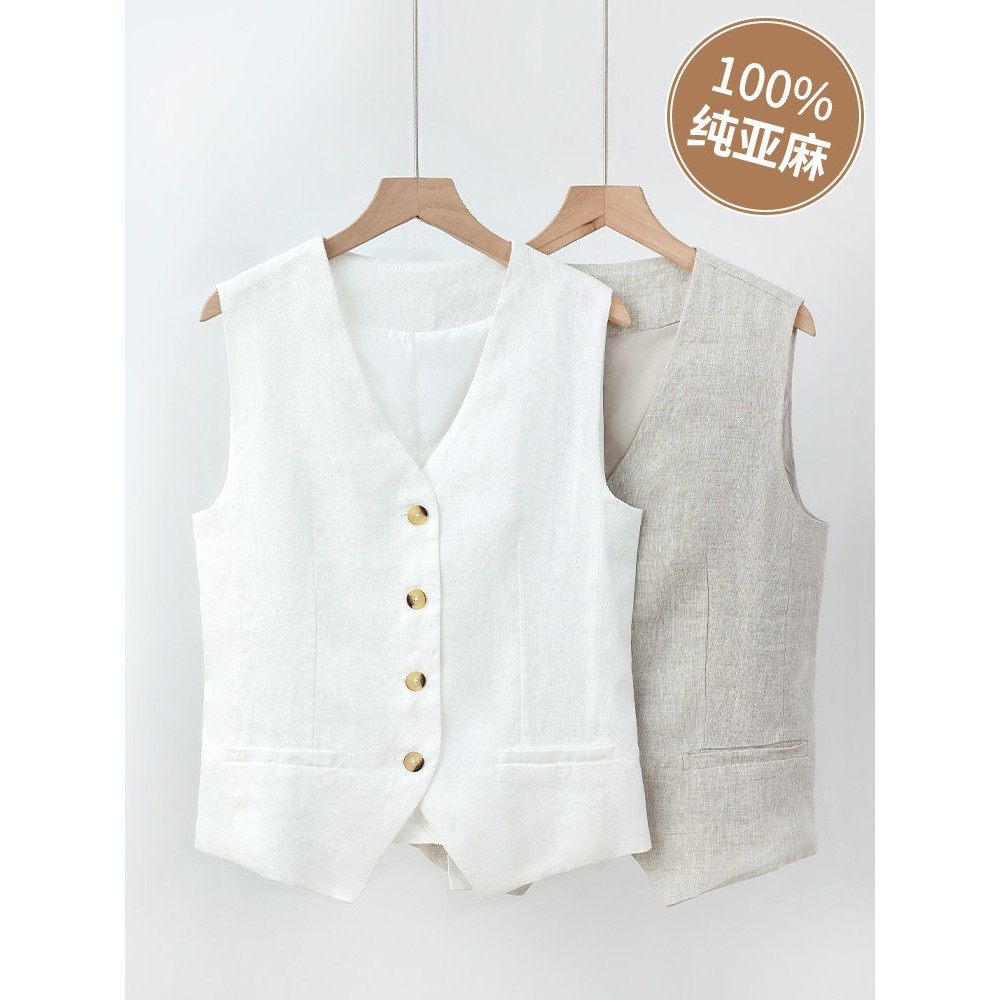 纯亚麻背心夏季薄妇女的外背心2025年新的修身短袖西装亚麻背心