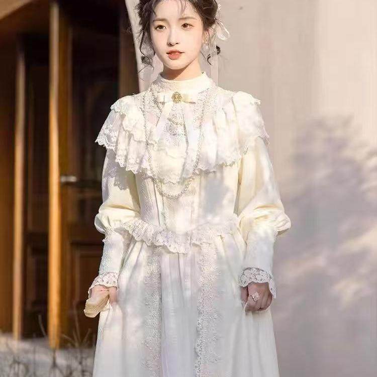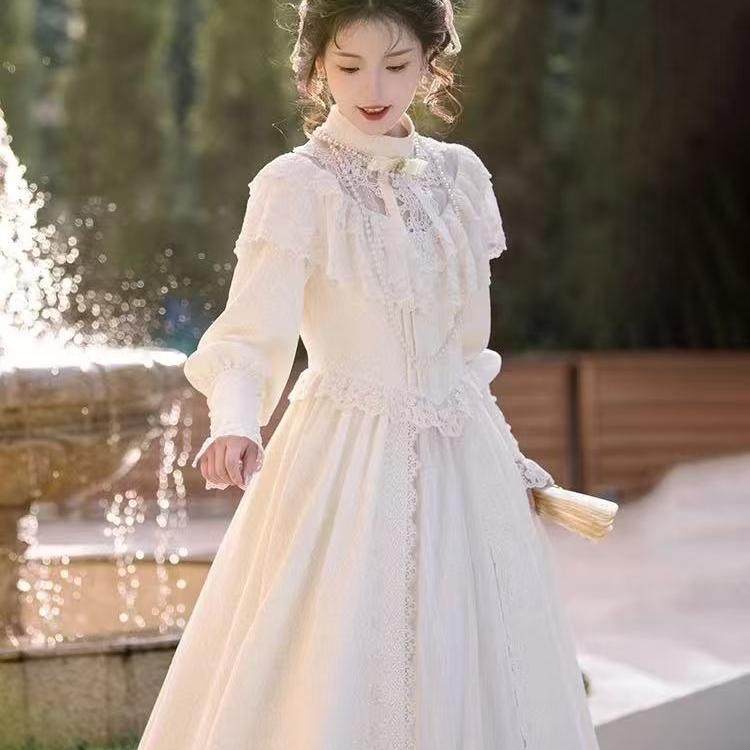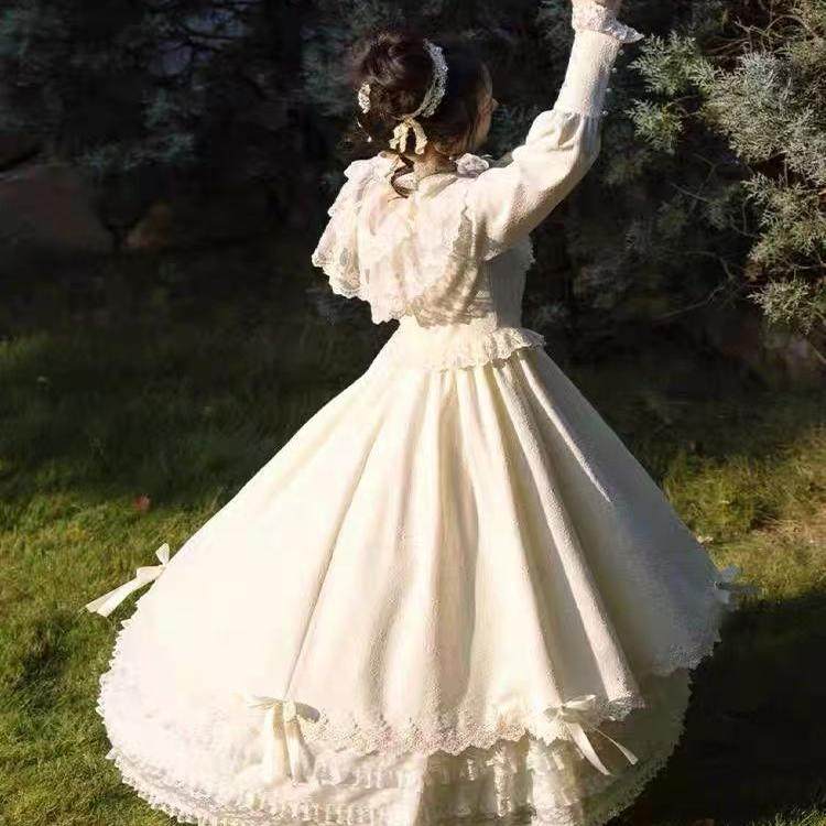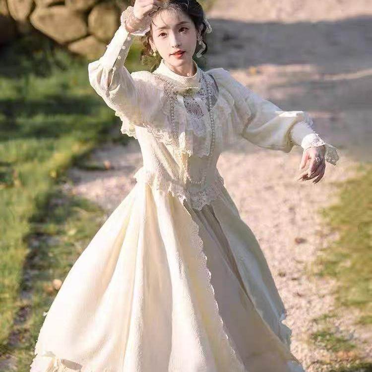 宫廷风复古华丽洋装礼裙碎花蕾丝公主连衣裙长袖收腰显瘦气质礼服
