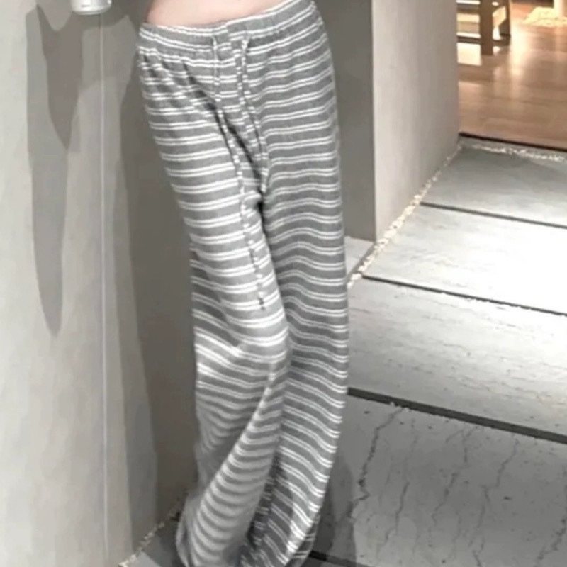 韩国东大门新款人手一条慵懒随意显瘦百搭松紧高腰条纹阔腿休闲裤