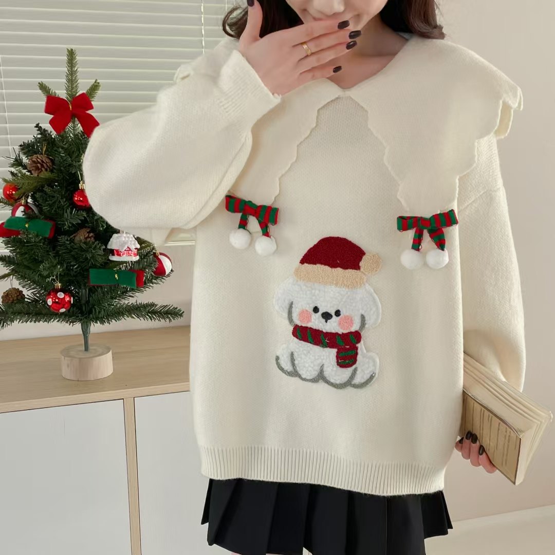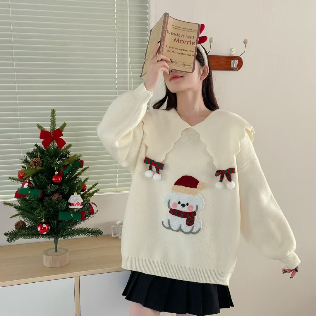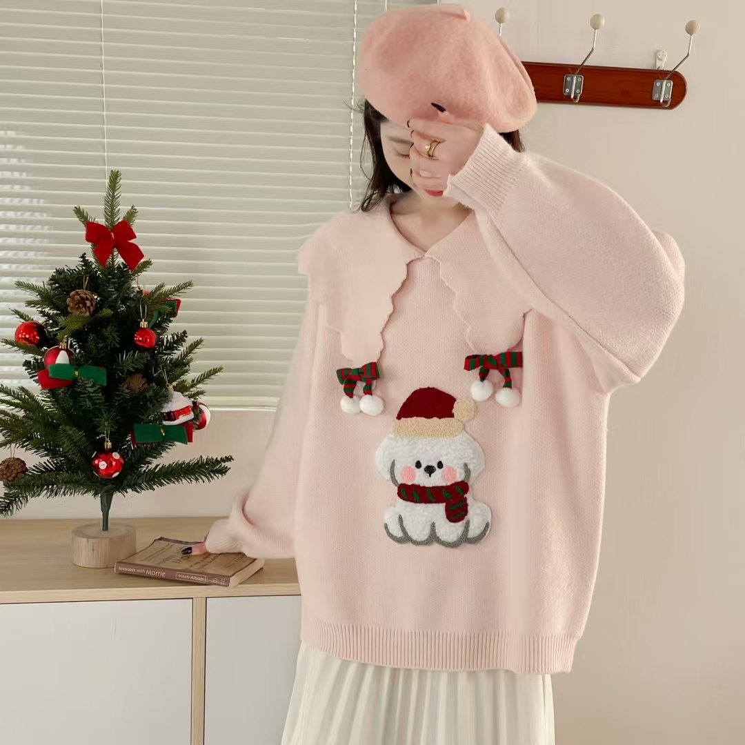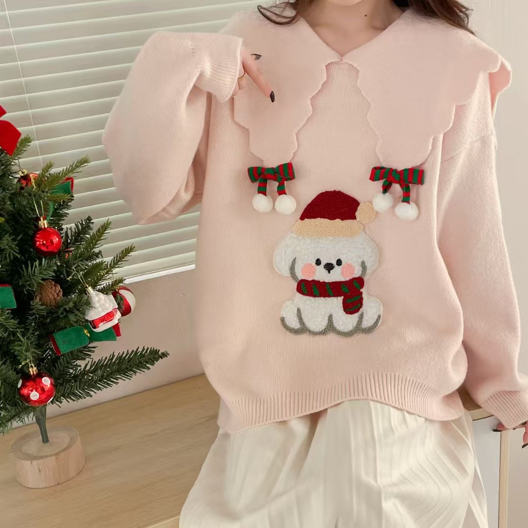 圣诞新年红色卡通娃娃领套头毛衣女2025春季新款宽松洋气针织上衣