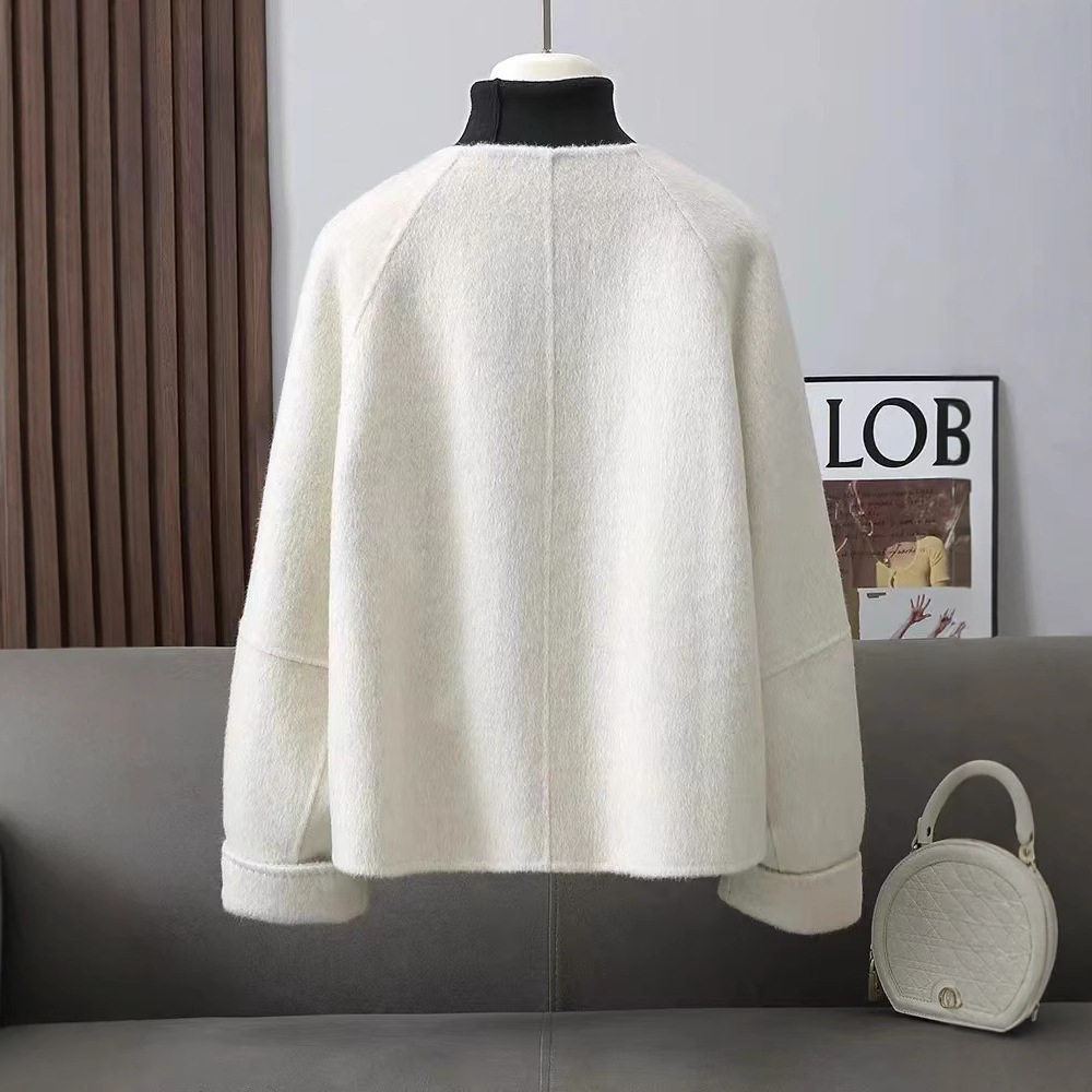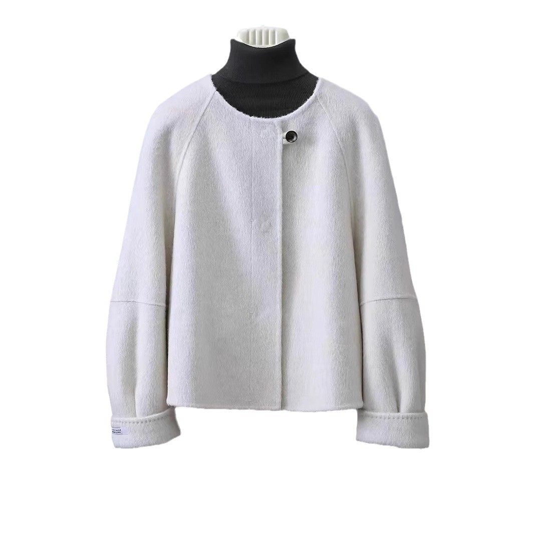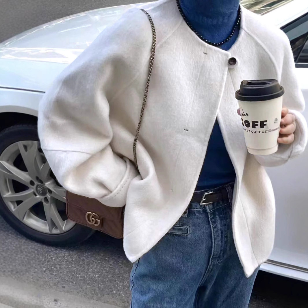 东大门阔型双面羊毛绒大衣短款小个子纯色圆领加厚保暖羊毛外套女