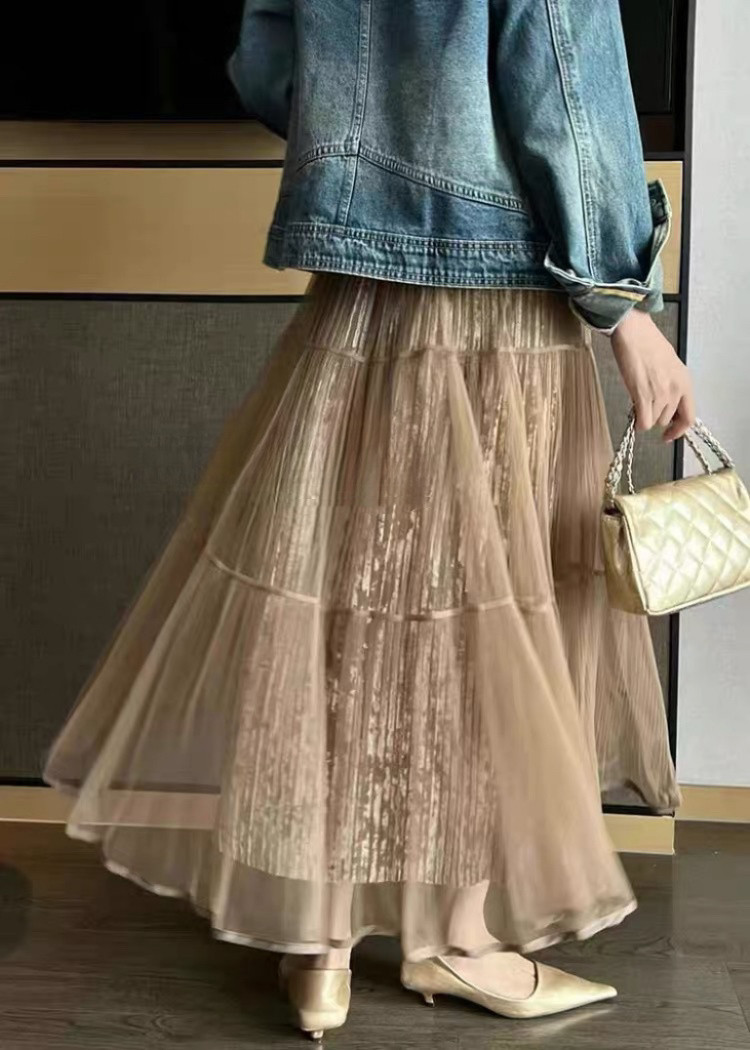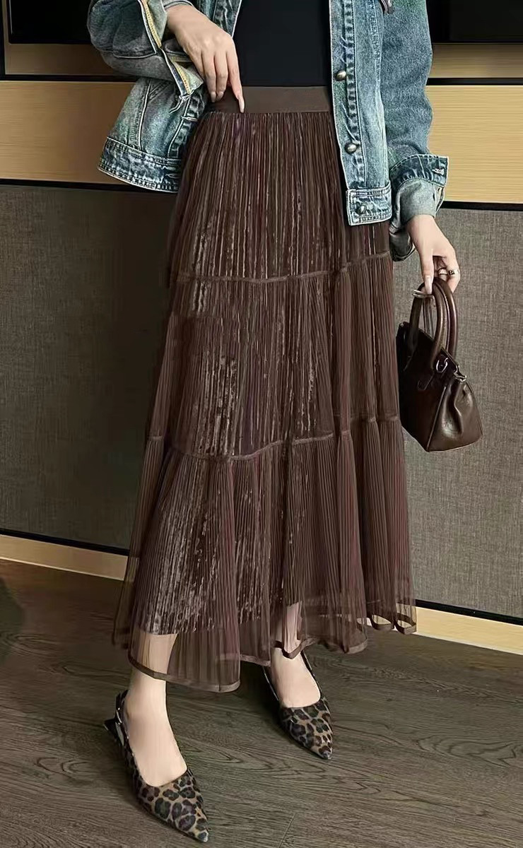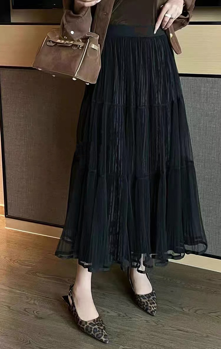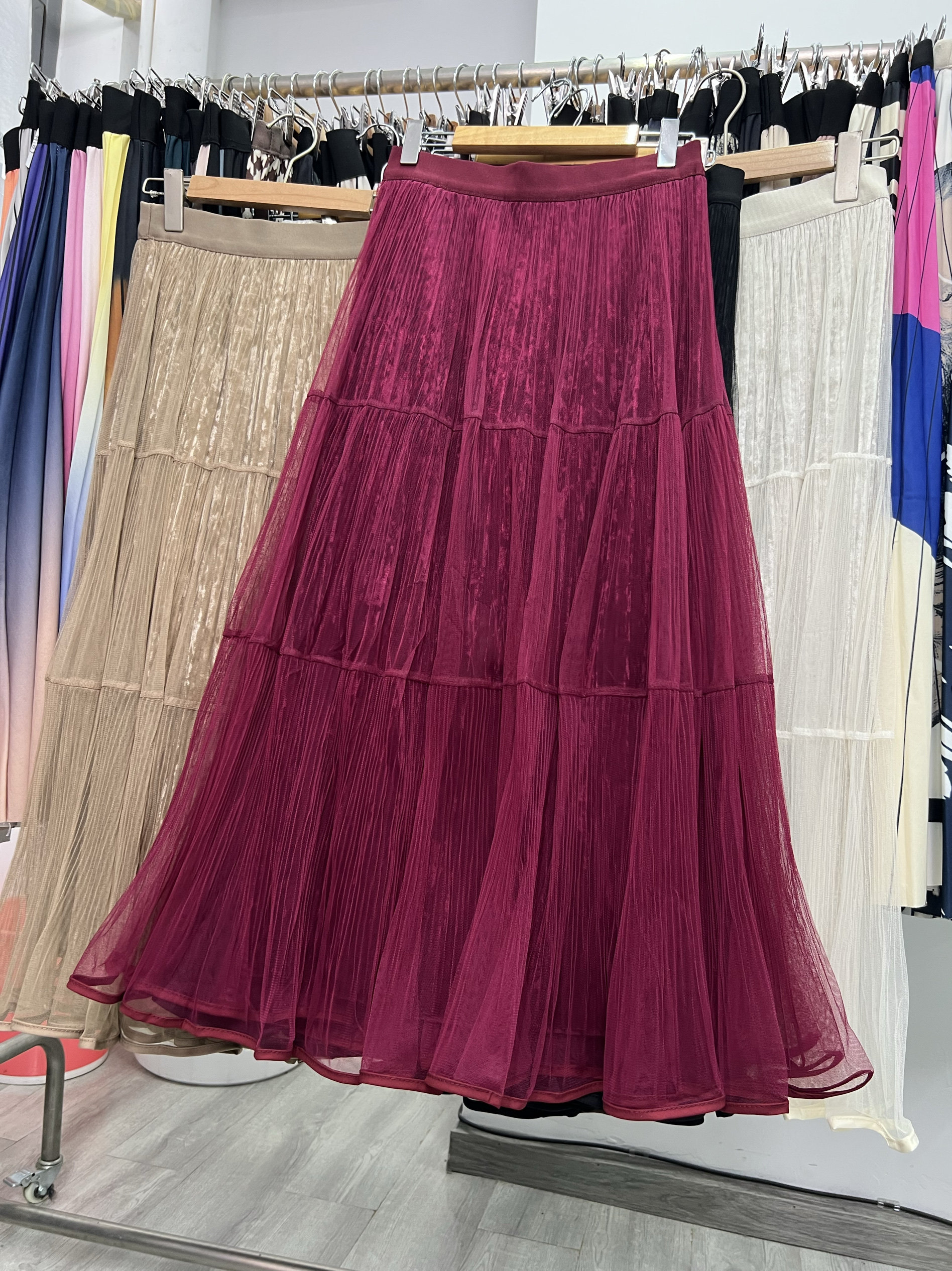秋冬厚丝绒复古松紧腰蕾丝网纱拼接百褶裙女高腰中长款显瘦半身裙