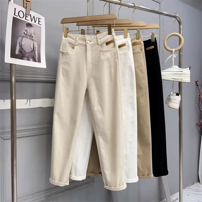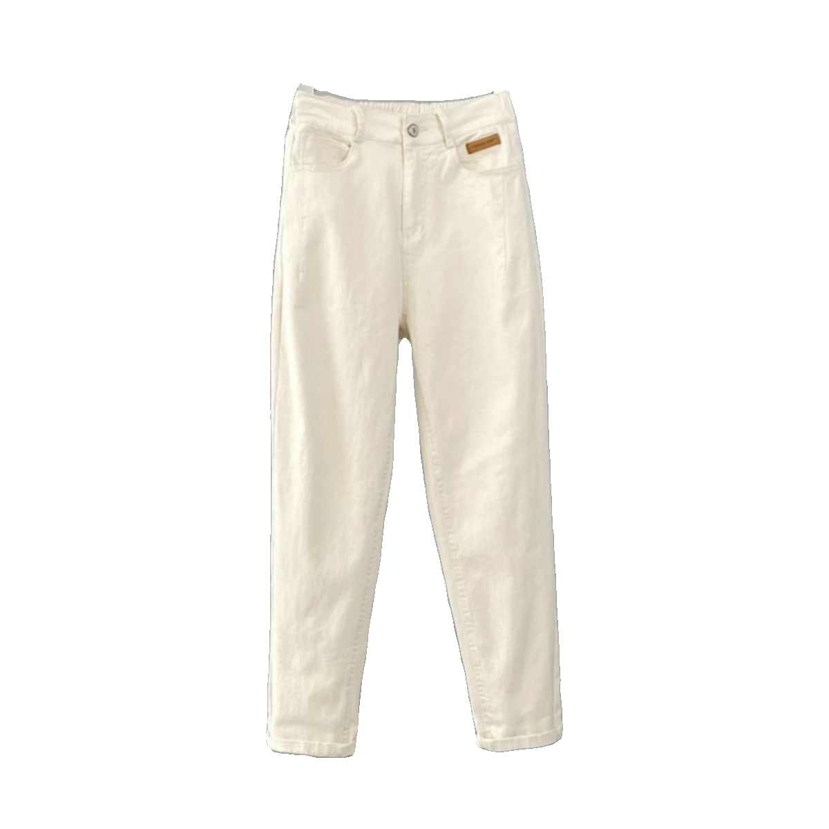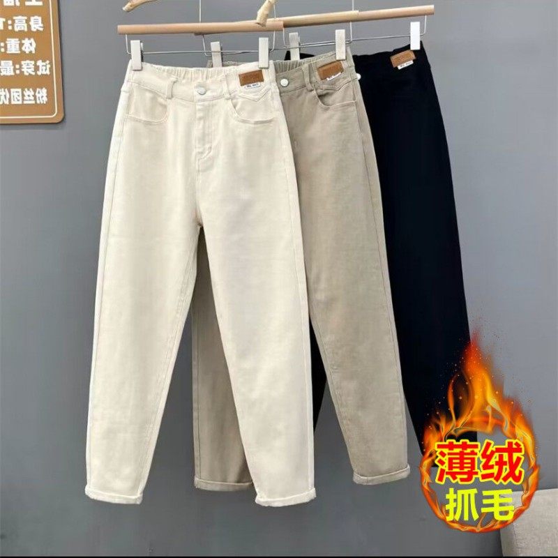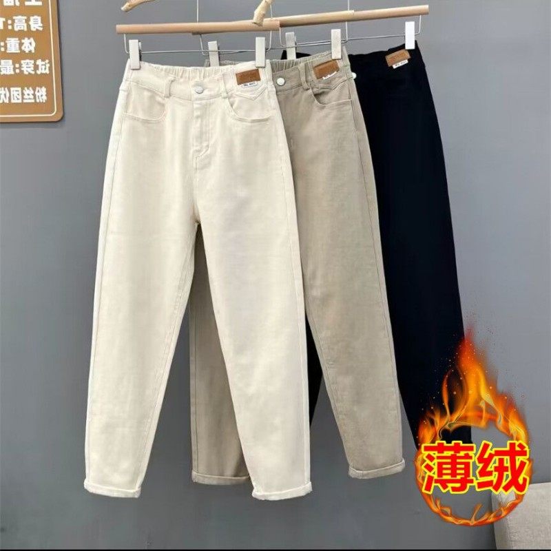 白色加绒牛仔裤女秋冬2025年新款宽松高腰直筒哈伦老爹萝卜裤子女