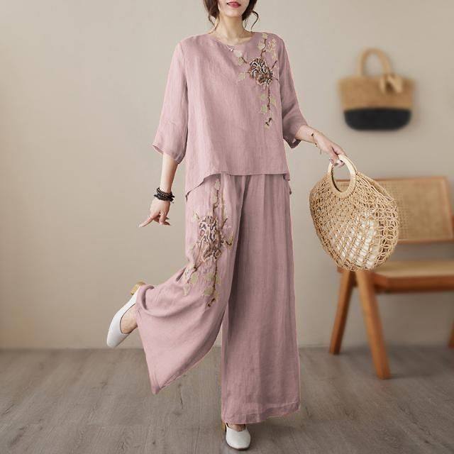 复古刺绣套装女夏季套头时尚衬衫轻薄阔腿裤显瘦妈妈两件套装