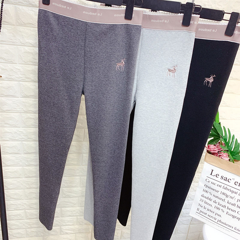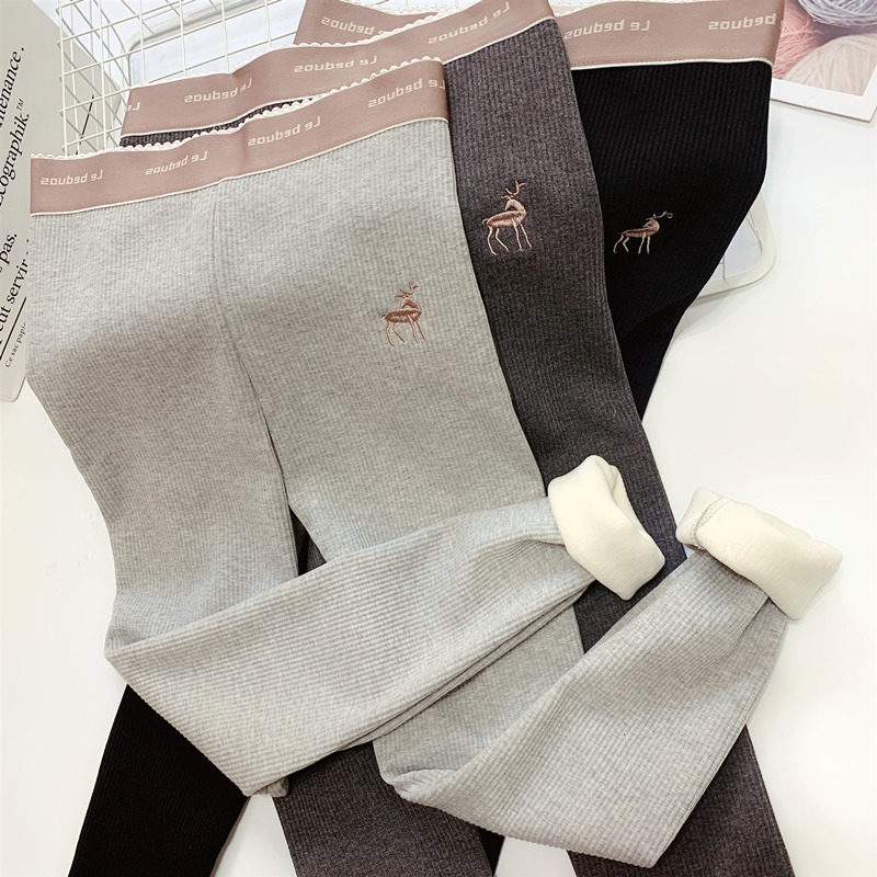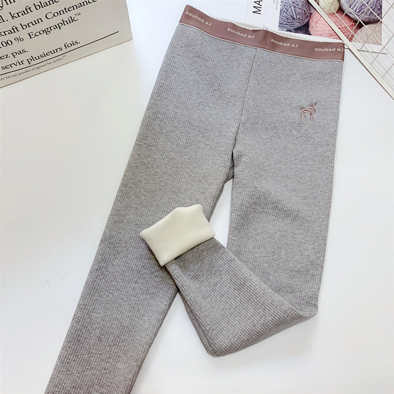 加绒加厚字母高腰弹力打底裤女秋冬装一体绒保暖螺旋竖纹小脚裤子