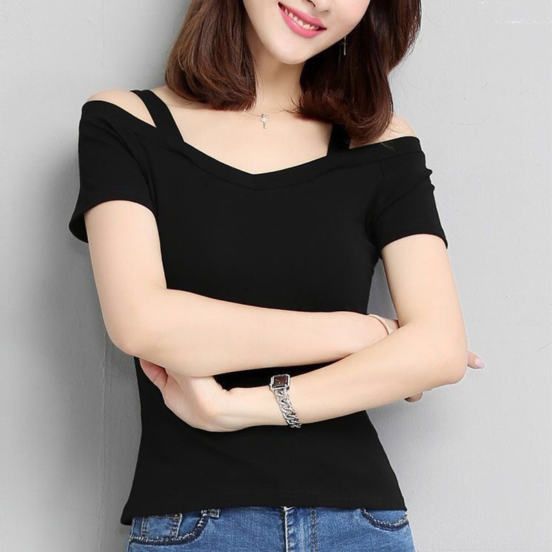 T恤女2025夏季韩版黑色露肩吊带短袖T恤女一字领露肩性感上衣新潮