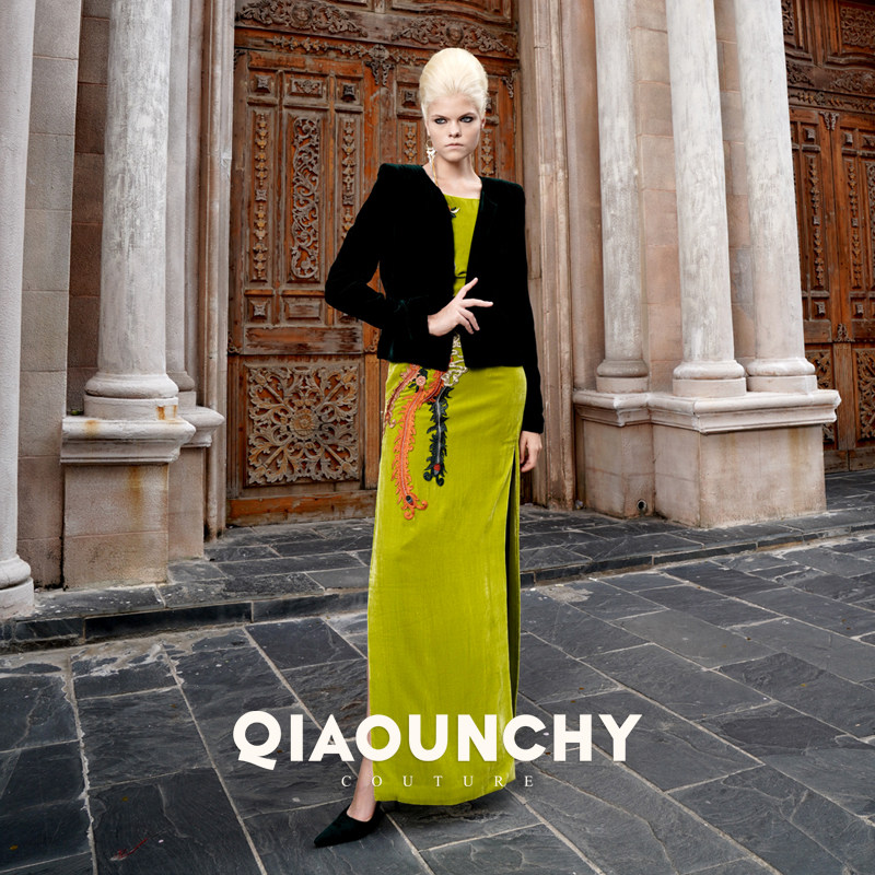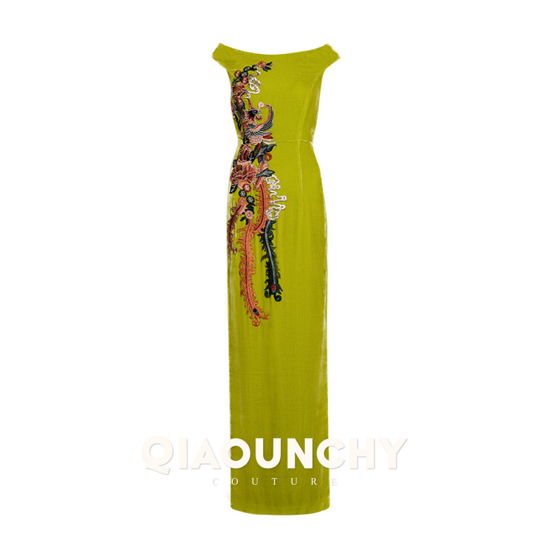 斑斓凤羽 QIAOUNCHY俏云曦 | 青苔绿真丝丝绒手缝绣法式连衣裙