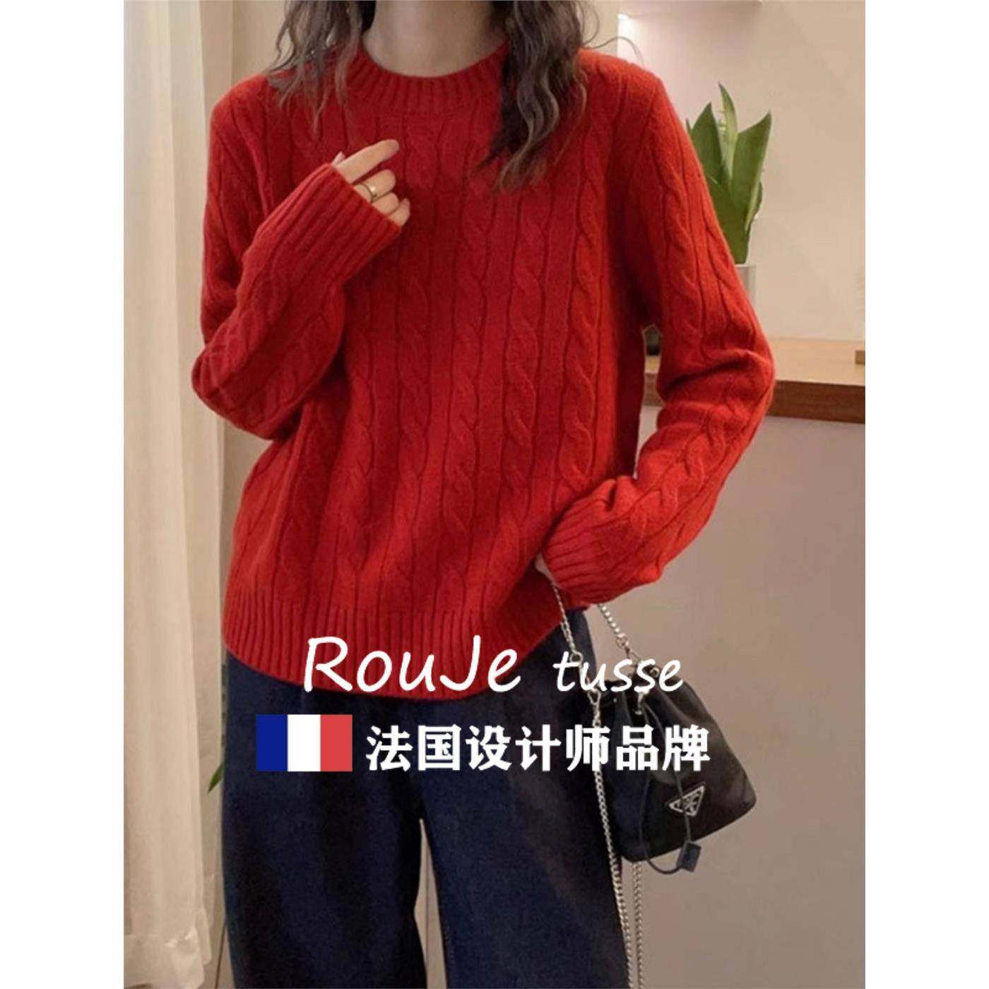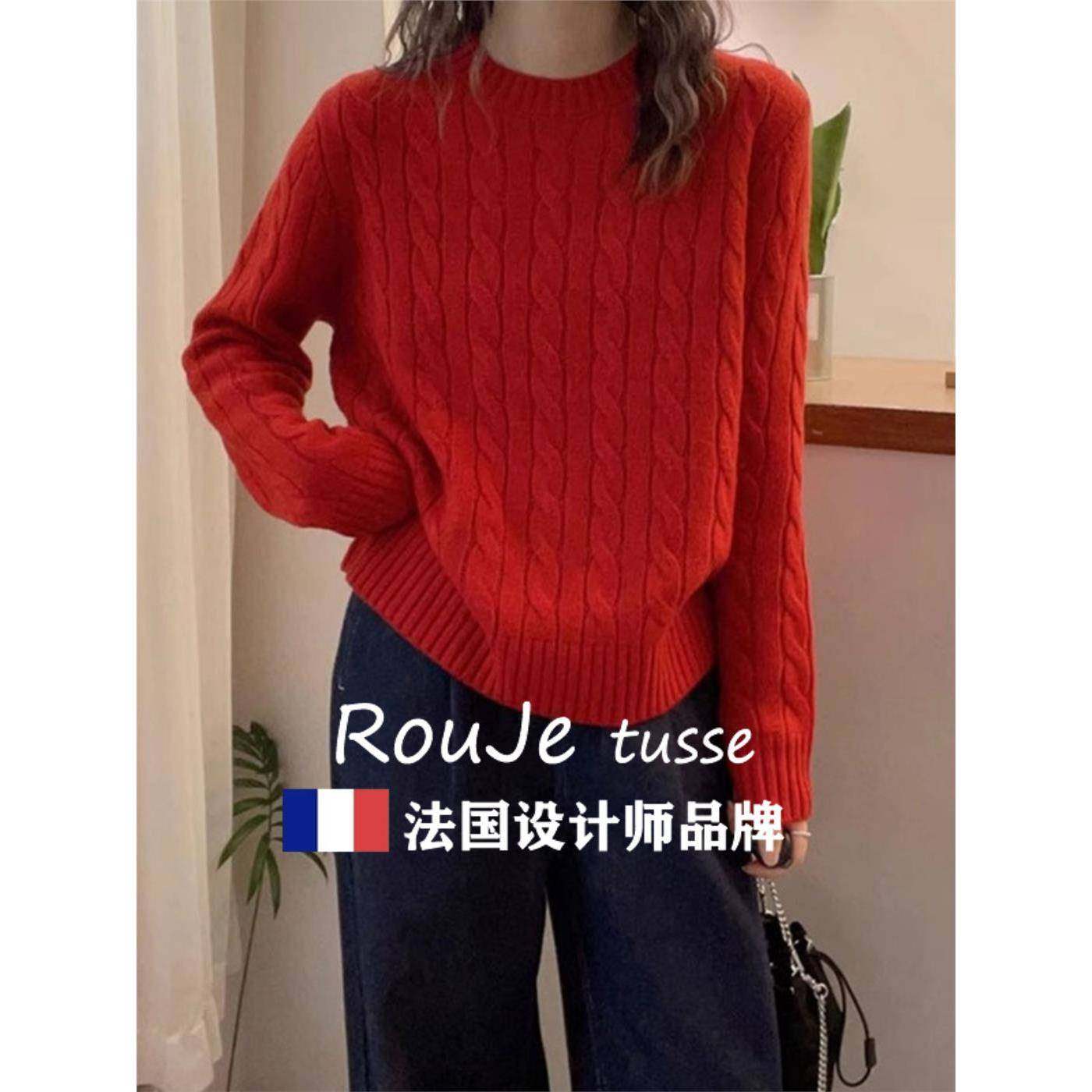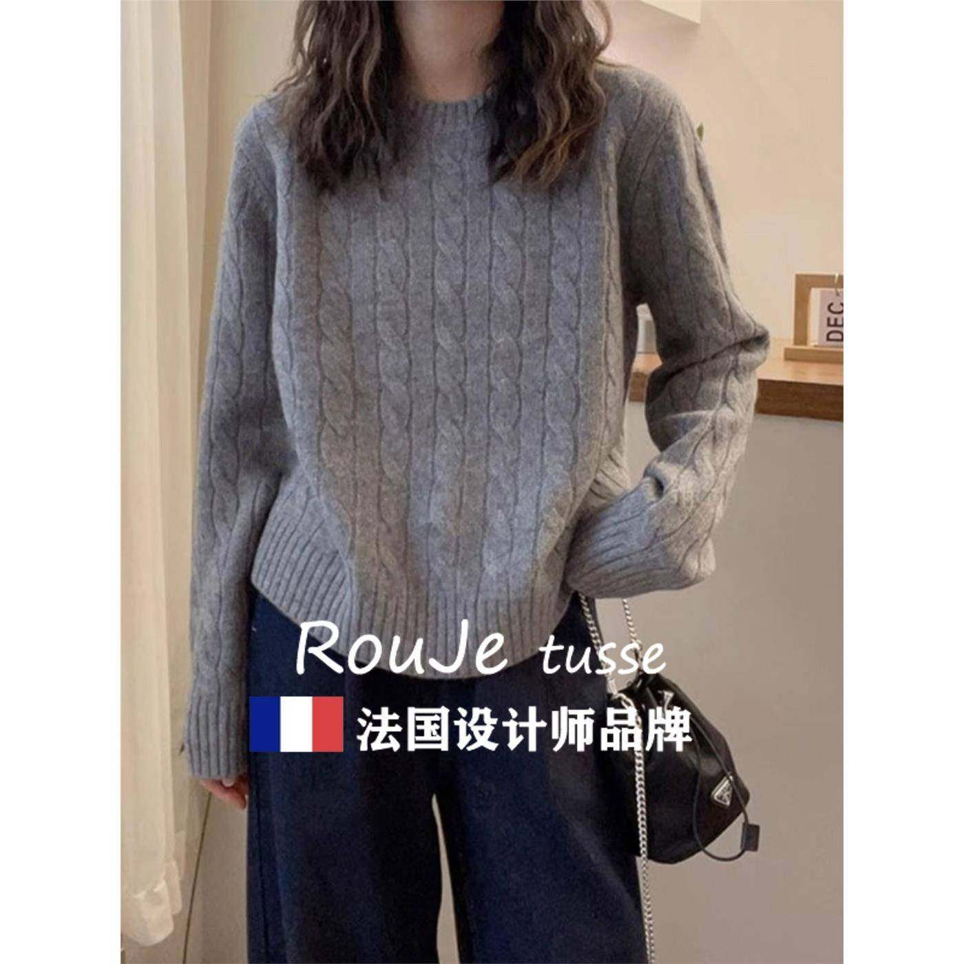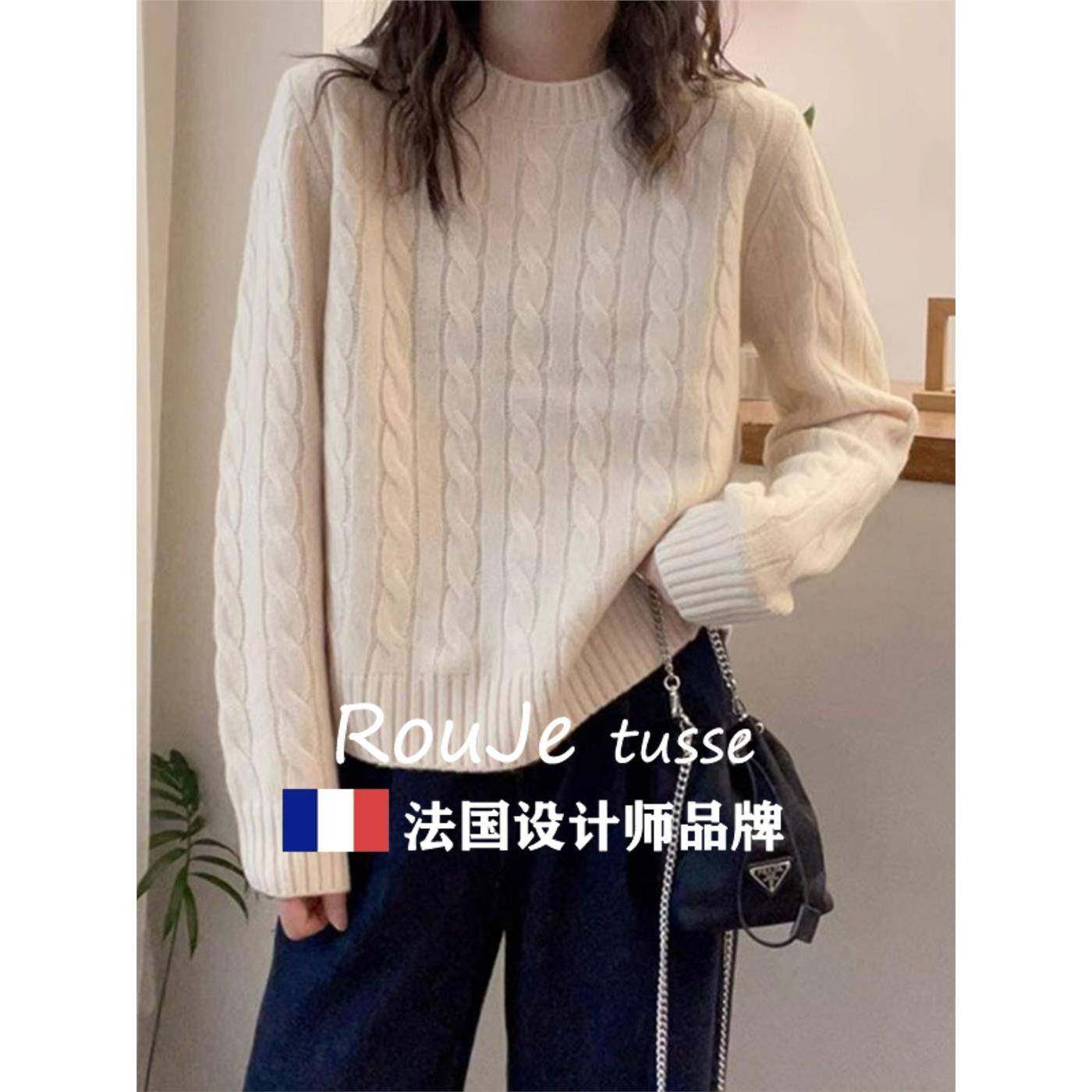 Rouje tusse慵懒麻花羊毛针织毛衣女套头宽松羊绒针织内搭上衣冬