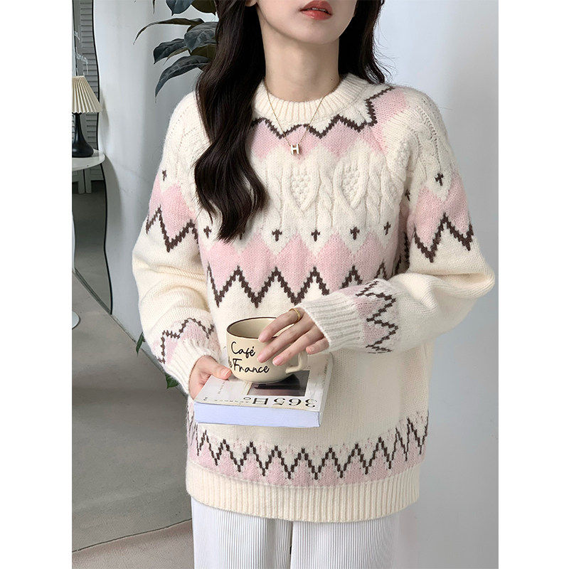 白色费尔岛复古菱格圆领毛衣女秋冬慵懒风设计感刺绣撞色针织衫厚