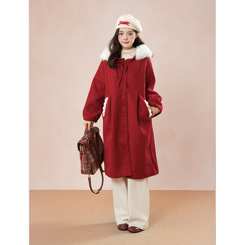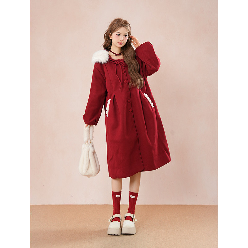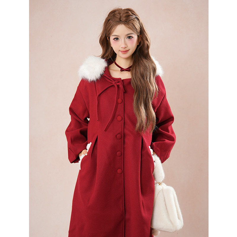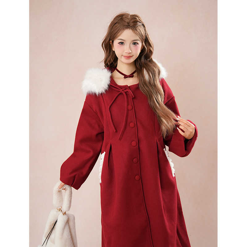 首页> 女装> 新年战袍学院风圣诞红色蝴蝶结大衣女秋冬季小个子中长款连帽外套
